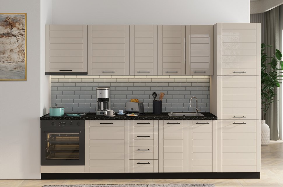 Die Küche DRINA in der Kombination aus opak-weißem Dekor und sandfarbener Lackfolie stellt die perfekte Lösung für moderne Küchenräume dar. Mit reduzierten Design, klaren Linien und neutralen Tönen fügt sie sich mühelos in verschiedene Einrichtungsstile ein und verleiht dem Raum ein Gefühl von Ordnung, Helligkeit und Harmonie. Die Funktionalität ist sorgfältig durchdacht – geschlossene Oberschränke tragen zu einem minimalistischen und harmonischen Erscheinungsbild bei, während die Unterschränke mit Schubladen eine einfache und effiziente Organisation des Küchenzubehörs ermöglichen. Die Möglichkeit zum Einbau einer Geschirrspülmaschine, eines Backofens und einer Dunstabzugshaube trägt zusätzlich zur rationellen Raumplanung bei, und das modulare Design erlaubt die Kombination verschiedener Elemente für vollständige Funktionalität.