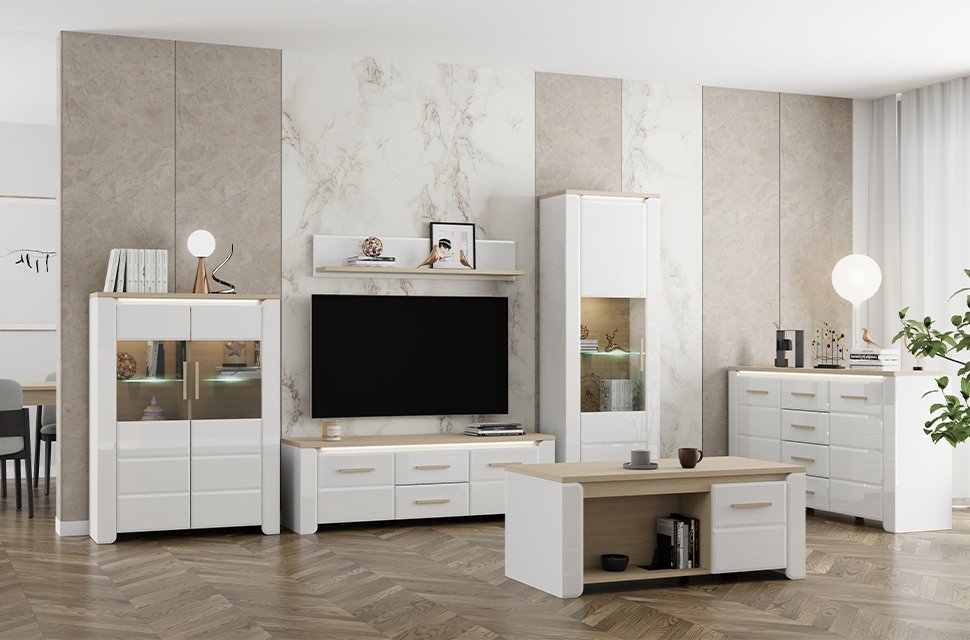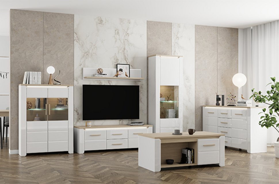 Das Möbelprogramm ABERDEEN für die Wohnzimmereinrichtung bietet eine moderne, schlichte und äußerst funktionale Lösung, um Ihre Wohnatmosphäre stilvoll zu gestalten. Die Kombination aus opak-weißem Dekor, heller Port-Eiche und weißer Hochglanzfolie, verleiht dem Raum Eleganz, Minimalismus und einen klar definierten, makellosen Stil.