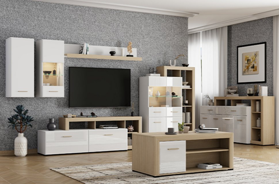 Das Möbelprogramm CARLOW für die Wohnzimmereinrichtung bietet eine moderne und praktische Lösung, um Ihre Wohnatmosphäre stilvoll zu gestalten. Die Kombination aus opak-weißem Dekor, heller Port-Eiche und heller Port-Eiche-Folie bringt eine Dosis Funktionalität, Wärme und ausgeprägte ästhetische Anziehungskraft in den Raum.