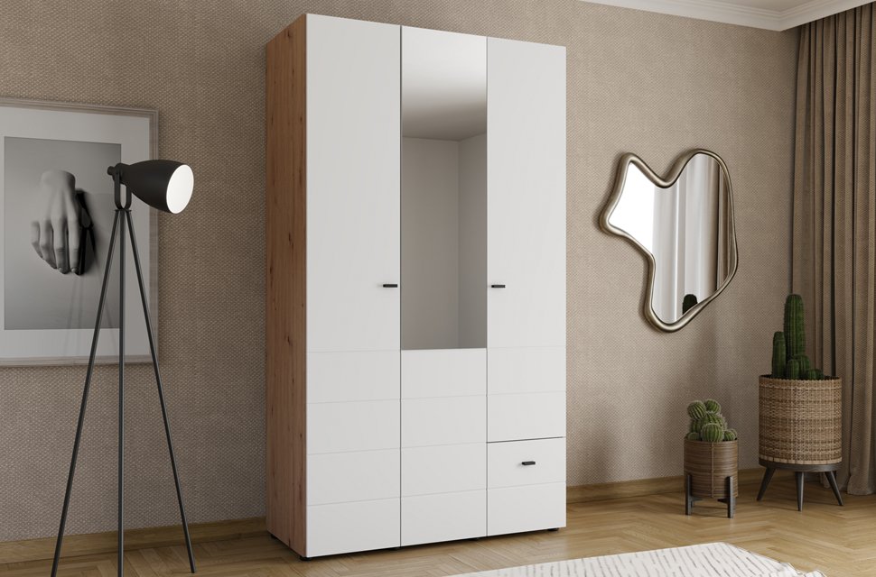 Die Schrank-Kollektion NEVIS stellt die perfekte Kombination aus Funktionalität, modernem Design und Anpassungsfähigkeit an verschiedene Interieurs dar. Alle Modelle dieser Linie zeichnen sich durch sorgfältig organisierte Stauräume für Garderobe aus – von Kleiderstangen und Regalen bis hin zu tiefen Schubladen und Unterteilungssegmenten, was eine übersichtliche und praktische Organisation ermöglicht. Die Kollektion ist in mehreren Dekorvarianten erhältlich, darunter opak-weiß und Artisan-Eiche Dekor sowie deren Kombinationen, was die Anpassung an verschiedene Raumstile erleichtert. Zusätzliche Elemente wie Spiegel tragen zur optischen Aufwertung des Raumes bei, während Eckmodelle jede Raumecke optimal nutzen. NEVIS Schränke bieten intelligente Lösungen für die Garderobenorganisation und lassen sich hervorragend miteinander kombinieren, sodass Sie Ihre ideale, auf Ihre Bedürfnisse und Ihren Geschmack abgestimmte Lösung schaffen können.
