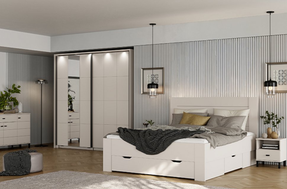 Das Schlafzimmer SALAMIS besticht durch ein reduziertes, modernes Design, das klare Geometrie und Funktionalität in den Fokus stellt. Ausgeführt in elegantem Kaschmir-Dekor mit dezenten schwarzen Griffen, schafft diese Kollektion eine ruhige und anspruchsvolle Atmosphäre, ideal für die tägliche Erholung und Entspannung. Die schlichte Form wird durch applizierte Linien auf den Frontendekoren zusätzlich betont, die visuelle Dynamik verleihen und die Regelmäßigkeit des Designs hervorheben, ohne dessen unaufdringliche Ästhetik zu stören.