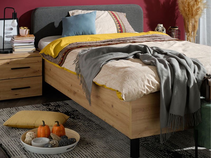 Das Bett BARLETA 120 aus Artisan Eiche mit gepolstertem Kopfteil und schwarzen Füßen ist so konzipiert, dass es einen Raum zum Ausruhen und Schlafen ausstattet. Dieses Bett passt in fast jede Umgebung und ist mit einer Matratze mit den Maßen 120 cm x 200 cm kompatibel.