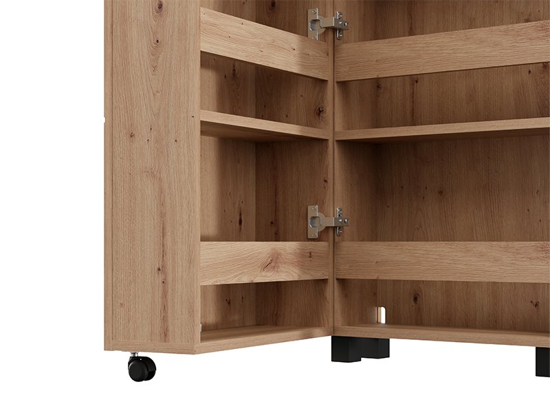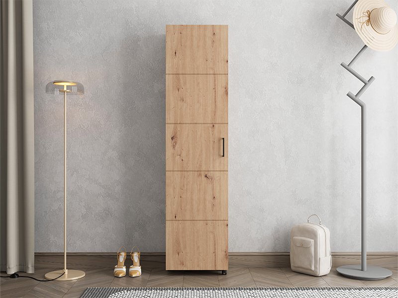 Der Schuhschrank ISLAY 46 1K h185 im Artisan-Eiche-Dekor mit einer Heißprägung von Rillen stellt eine praktische und elegante Lösung für den Flur dar. Das Innere dieses einflügeligen Schuhschranks mit geschlossenen Regalen ermöglicht eine übersichtliche und funktionale Organisation von Schuhen.