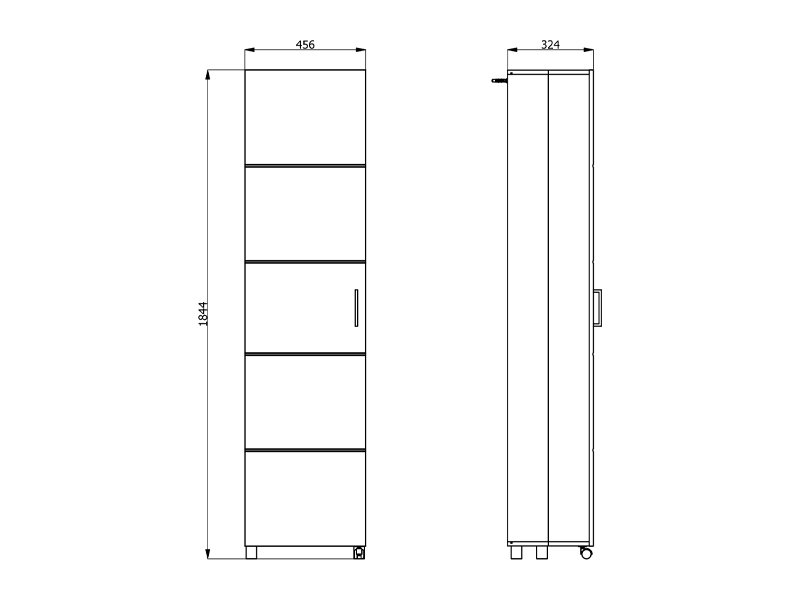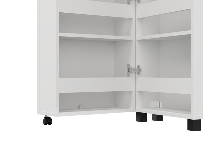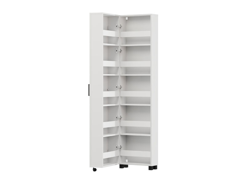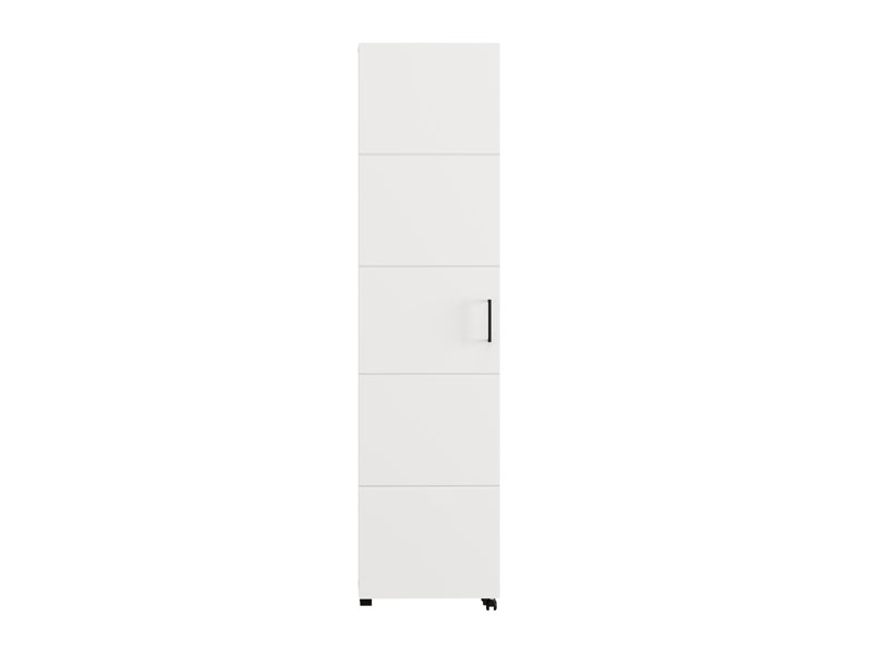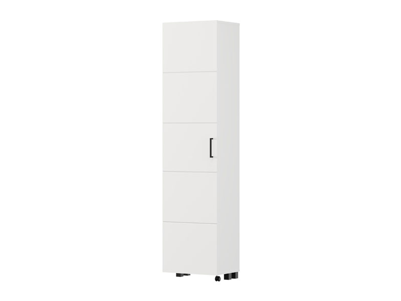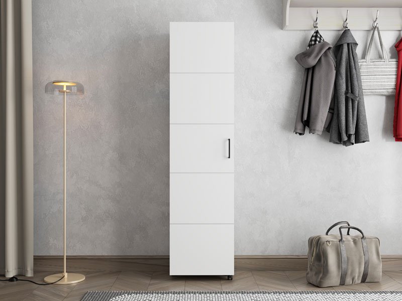 Der Schuhschrank ISLAY 46 1K h185 im opak-weißen Dekor mit einer Heißprägung von Rillen stellt eine praktische und elegante Lösung für den Flur dar. Das Innere dieses einflügeligen Schuhschranks mit geschlossenen Regalen ermöglicht eine übersichtliche und funktionale Organisation von Schuhen.