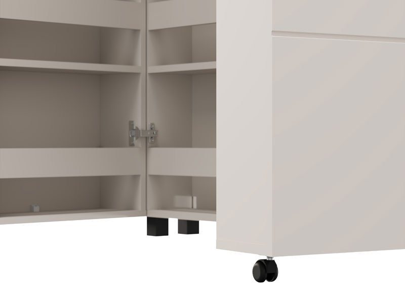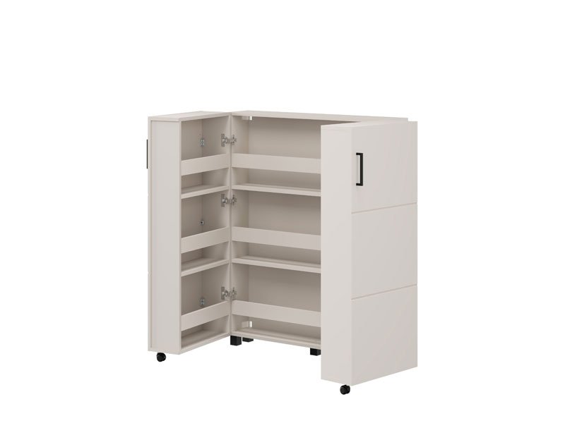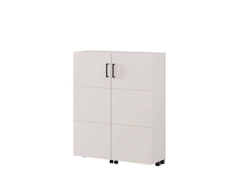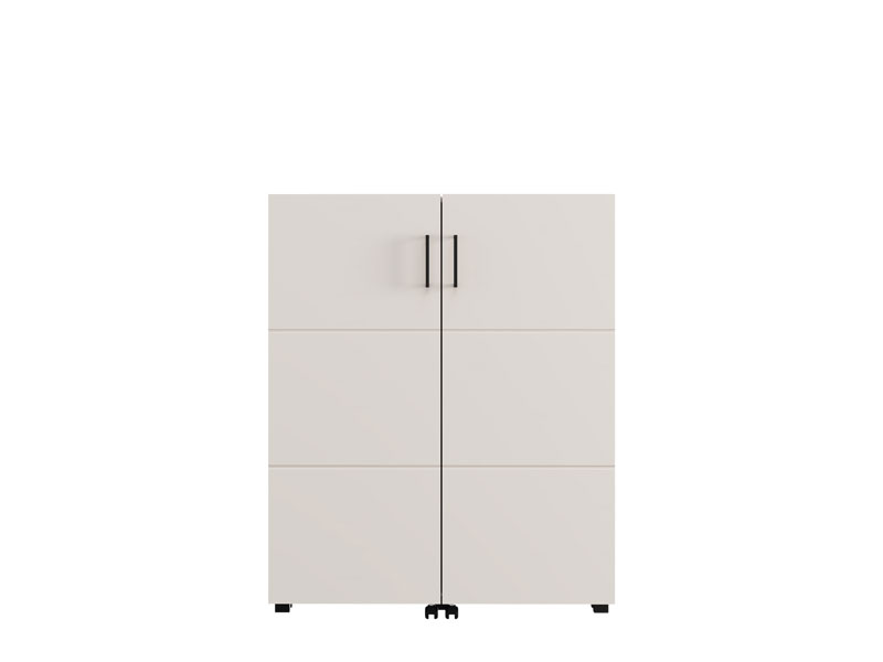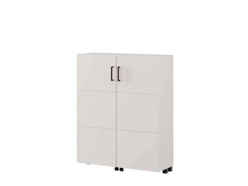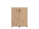 Der Schuhschrank ISLAY 91 2K h113 im Kaschmir-Dekor mit einer Heißprägung von Rillen stellt eine praktische und elegante Lösung für den Flur dar. Das Innere dieses zweiflügeligen Schuhschranks, ähnlich einer Kommode mit geschlossenen Regalen, ermöglicht eine übersichtliche und funktionale Organisation von Schuhen.