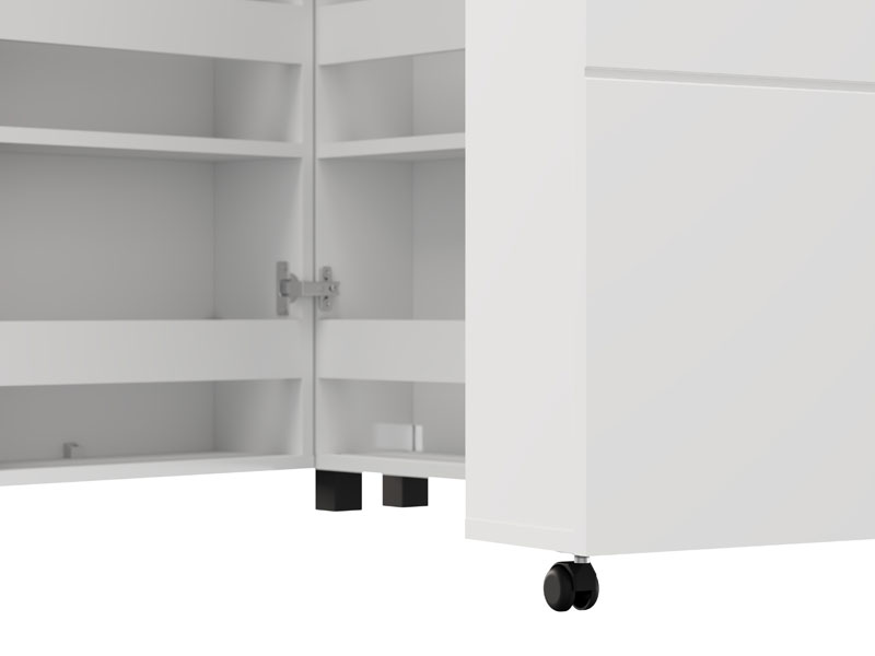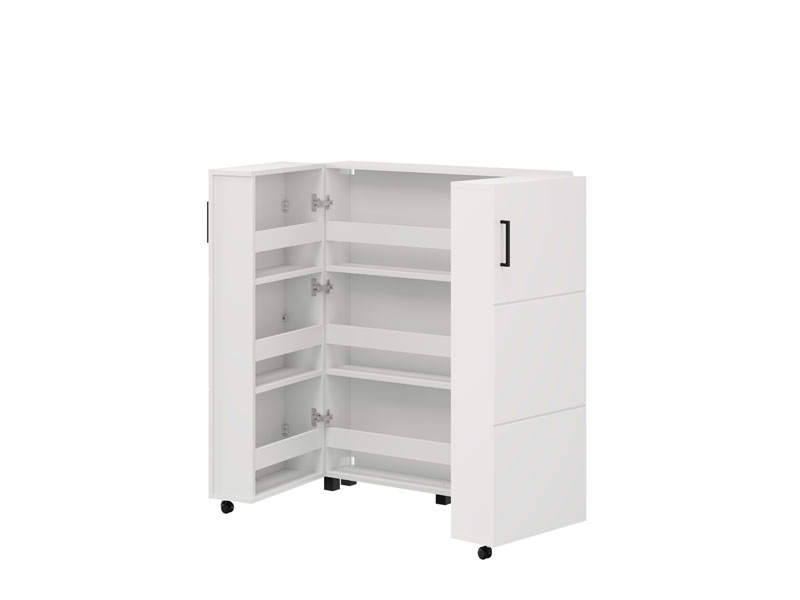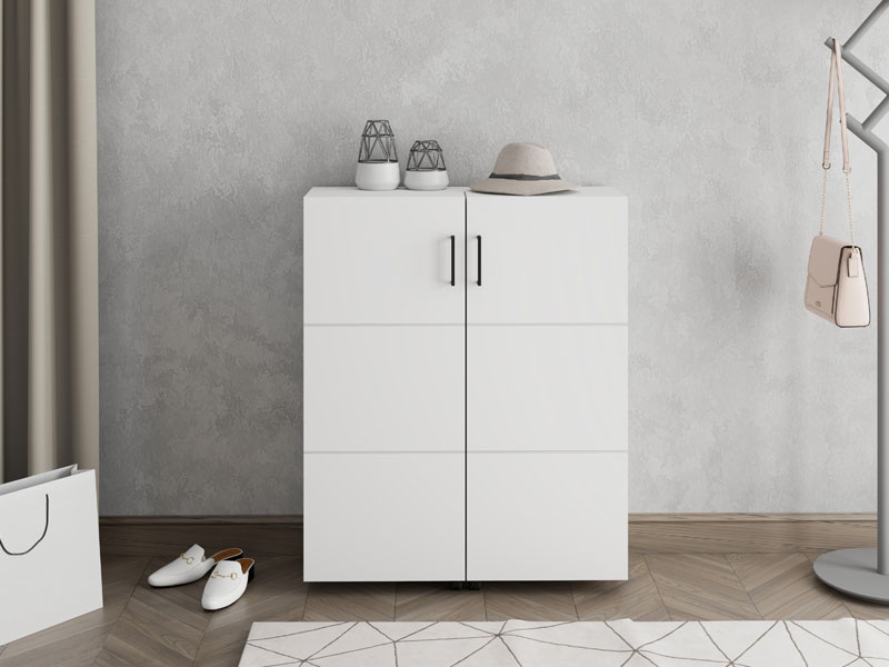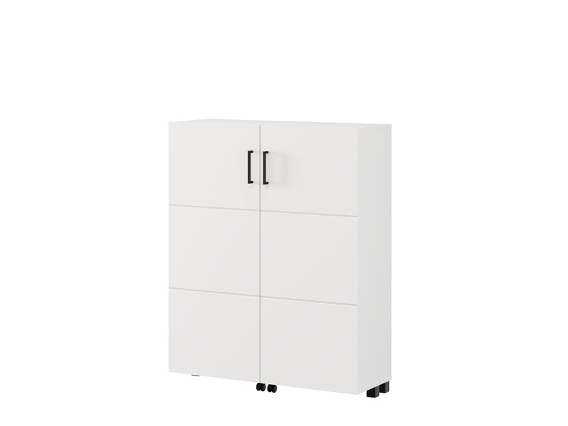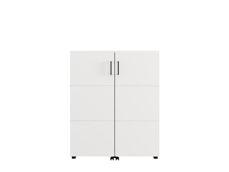 Der Schuhschrank ISLAY 91 2K h113 im opak-weißen Dekor mit einer Heißprägung von Rillen stellt eine praktische und elegante Lösung für den Flur dar. Das Innere dieses zweiflügeligen Schuhschranks, ähnlich einer Kommode mit geschlossenen Regalen, ermöglicht eine übersichtliche und funktionale Organisation von Schuhen.