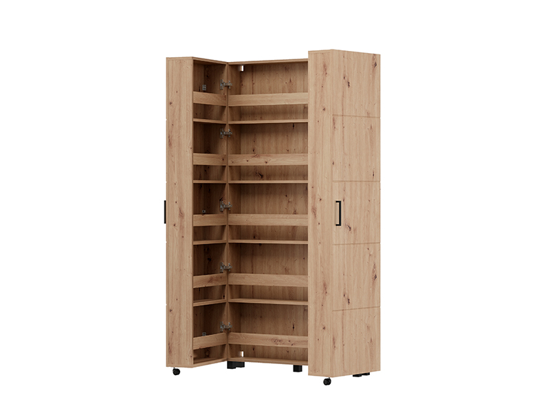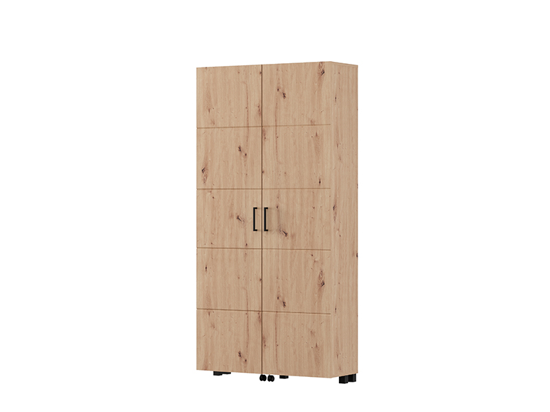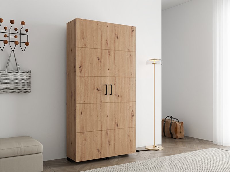Der Schuhschrank ISLAY 91 2K h185 im Artisan-Eiche-Dekor mit einer Heißprägung von Rillen auf der Front stellt eine praktische und elegante Lösung für den Flur dar. Das Innere dieses zweiflügeligen Schuhschranks mit geschlossenen Regalen ermöglicht eine funktionale und übersichtliche Organisation von Schuhen.