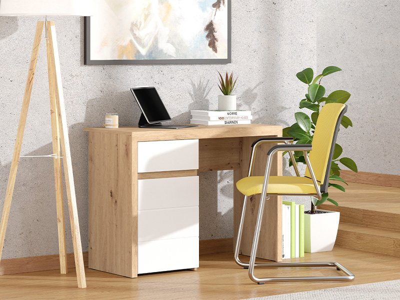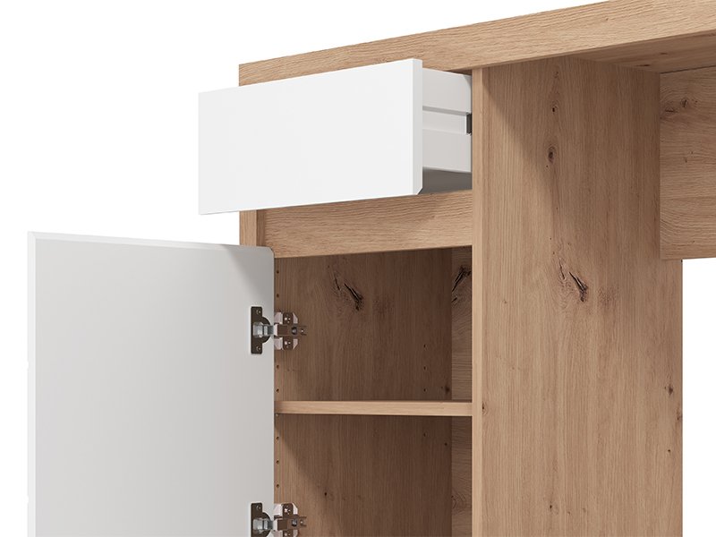 Der Computertisch DIOFANT 1F1V LP in der Kombination aus Artisan-Eiche, opak-weiß und Artisan-Eiche-Folie zeichnet sich durch ein modernes und elegantes Design mit grifflosen Fronten aus. Der Stauraum besteht aus einem geschlossenen Fach und einer Schublade, die eine übersichtliche und praktische Aufbewahrung ermöglichen. Dank der funktionalen Organisation und ästhetisch aufeinander abgestimmten Dekors ist der Computertisch DIOFANT 1F1V LP ein unverzichtbares Element für die Einrichtung des Arbeitsbereichs.