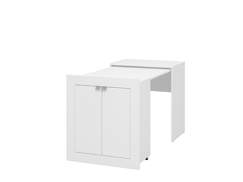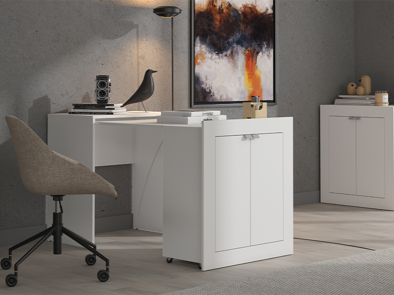 Der Computertisch EUDOX im opak-weißen Dekor ist ein multifunktionales Möbelstück, das Kommode und Computertisch vereint. Der Kommodenteil lässt sich auf Rollen ausziehen, wodurch rasch und mühelos eine zusätzliche Arbeitsfläche geschaffen wird. Dieses praktische System ermöglicht eine effiziente Raumnutzung und einfache Anpassung an verschiedene Bedürfnisse. Dank des funktionalen Designs und der neutralen Ästhetik ist der Computertisch EUDOX eine moderne und praktische Wahl für die Organisation des Arbeitsbereichs.