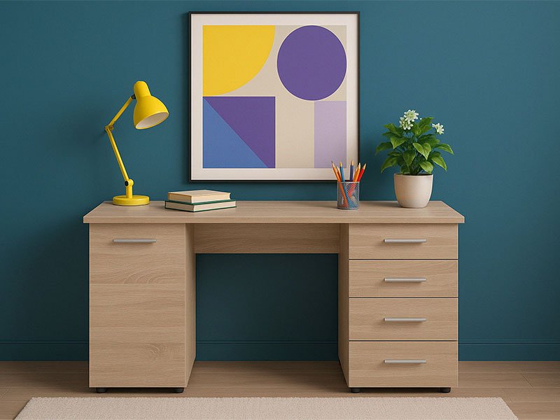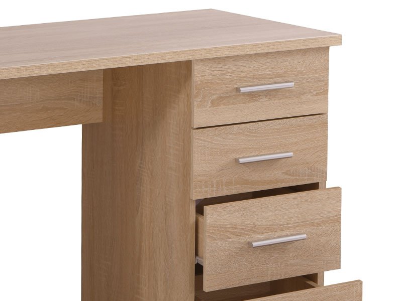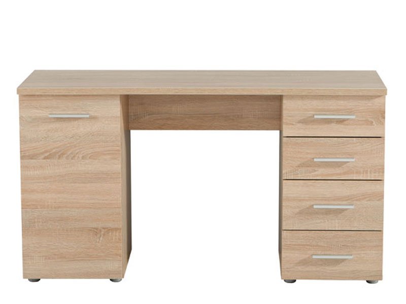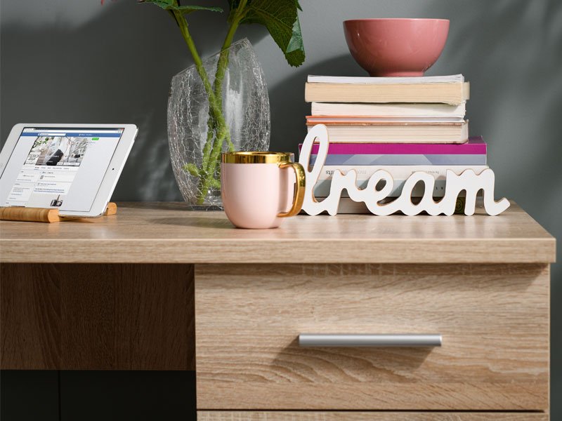 Der Computertisch LIBER, im Sonoma-Eiche-Design, ist das Hauptdetail eines perfekt funktionellen Arbeitsraums, in dem alles Ordnung und harmonische Organisation ausstrahlen soll. Die praktische Komposition der Arbeitsfläche, des Schubladensystems und des geschlossenen Flügelteils bringt genügend Raum für das Ablegen und das Sortieren von wichtigen Dingen und Dokumenten.