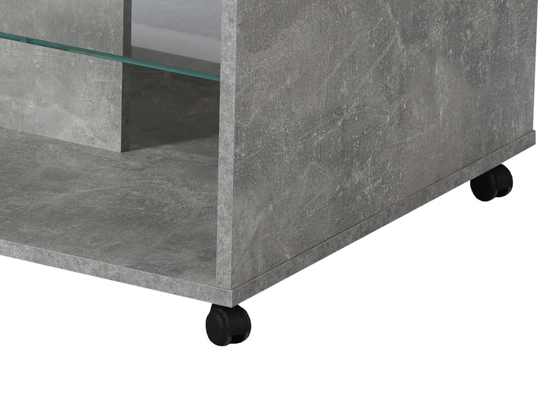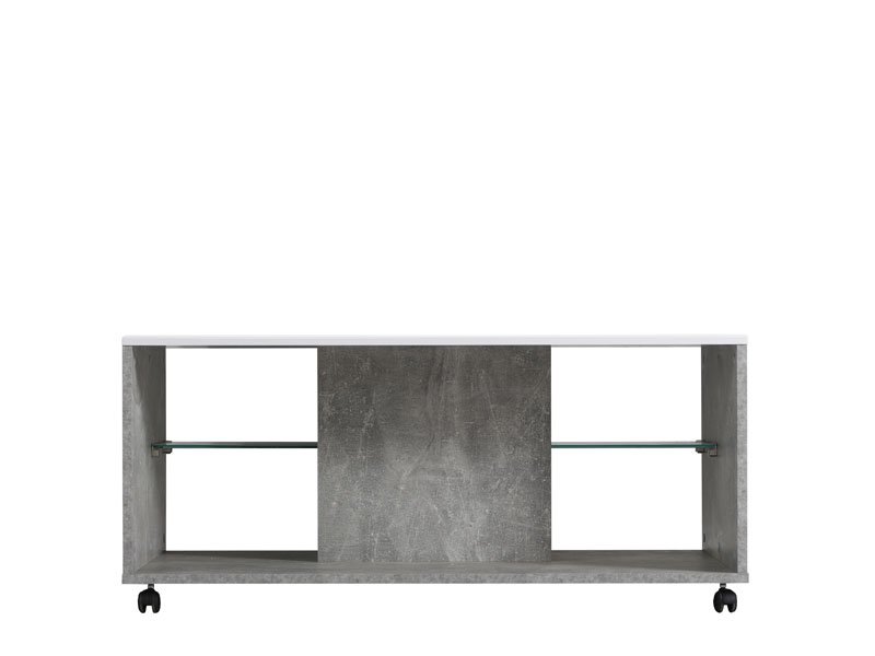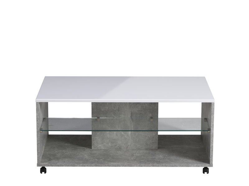 Klub Tisch BERT, im Dekor des Betons mit weißer Lackfolie, hat praktische und ästhetische effektreiche Glasregale unter der Arbeitsfläche, geeignet zur Ablage der Lieblingsbücher oder Zeitschriften. Der Klub Tisch BERT trägt dem modernen thematischen Konzept der Einrichtung des Wohnzimmer bei.