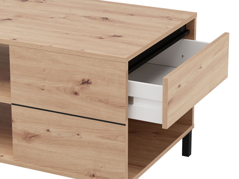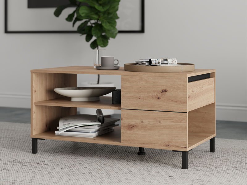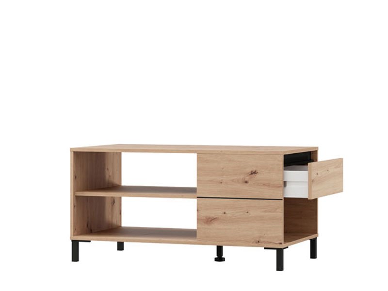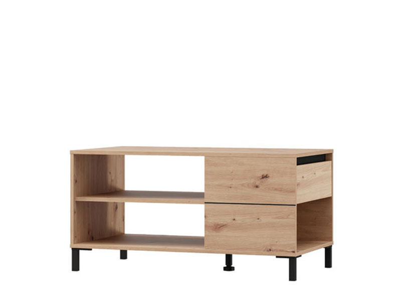 Der Couchtisch MARRON in der Dekorkombination Artisan-Eiche und mattschwarzer Folie verleiht dem Raum natürliche Wärme sowie einen modernen visuellen Kontrast. Unterhalb der Tischfläche befindet sich ein Trennregal, das praktischen und organisierten Stauraum für verschiedene Gegenstände bietet. Der Couchtisch MARRON ist Teil des MARRON-Elementsystems, welches sich durch die harmonische Verbindung rustikaler Farbtöne mit der Funktionalität eines modernen Designs auszeichnet.