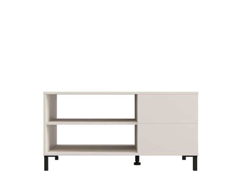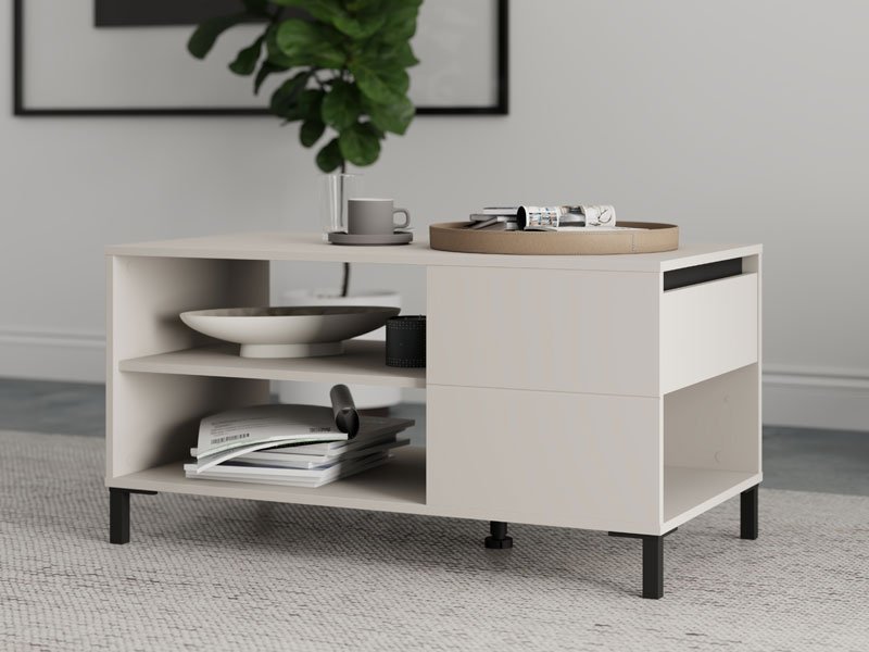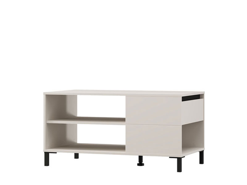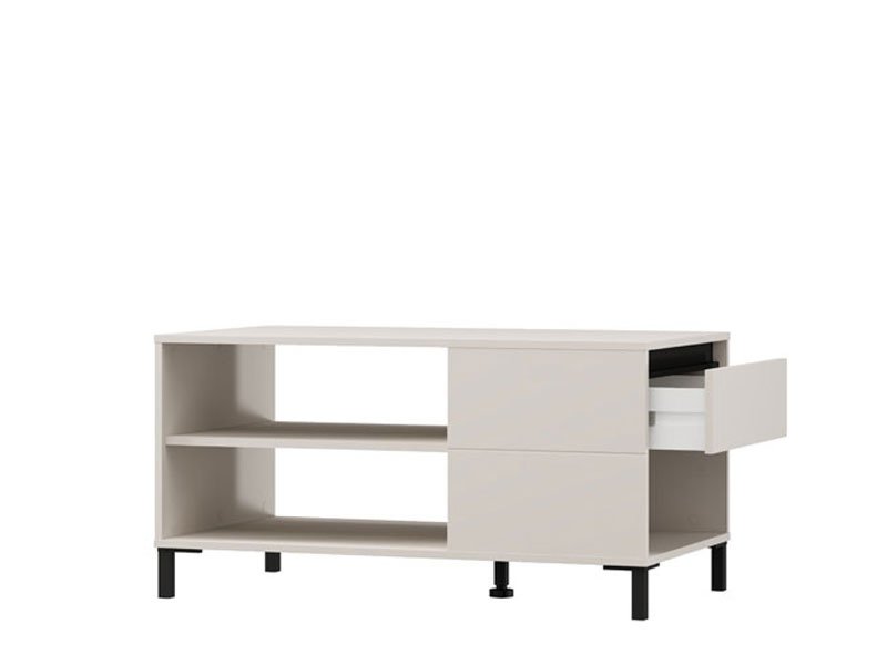 Der Couchtisch MARRON in der Dekorkombination Kaschmir und mattschwarzer Folie verleiht dem Raum einen modernen visuellen Kontrast und anspruchsvolle Wärme. Unterhalb der Tischfläche befindet sich ein Trennregal, das praktischen und organisierten Stauraum für Aufbewahrung verschiedener Gegenstände bietet. Der Couchtisch MARRON ist Teil des MARRON-Elementsystems, welches sich durch die harmonische Verbindung moderner Farbtöne mit der Funktionalität eines zeitgenössischen Designs auszeichnet.