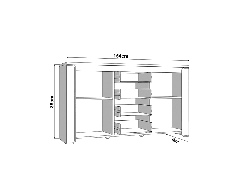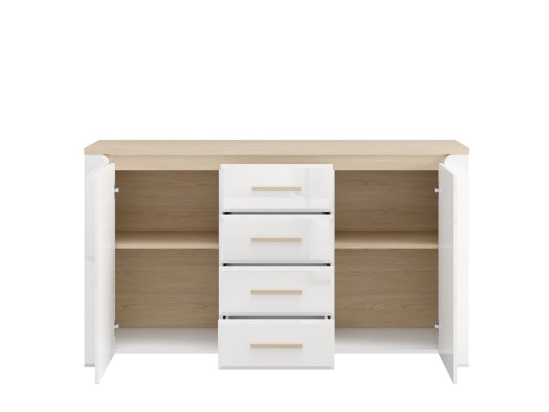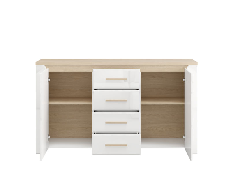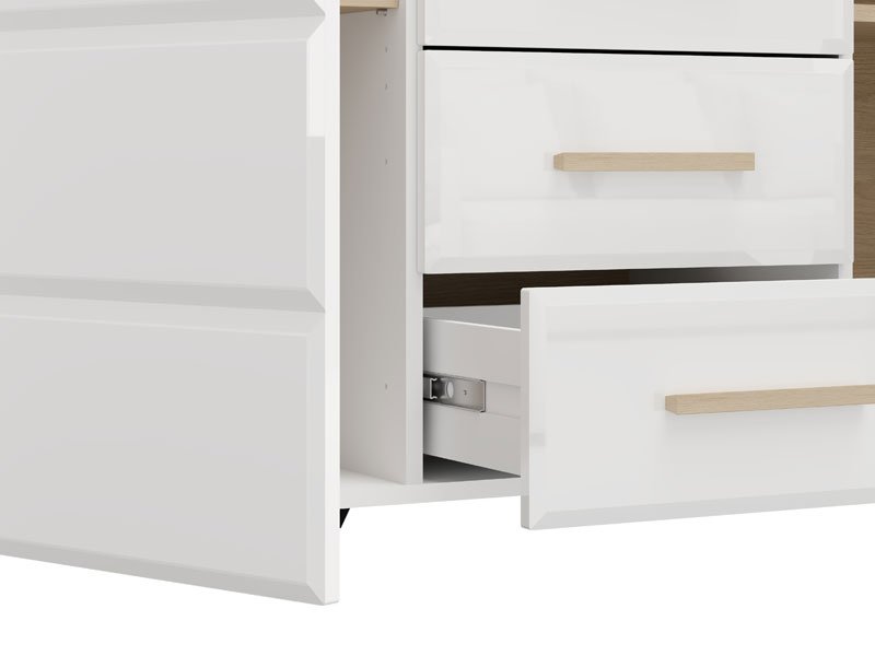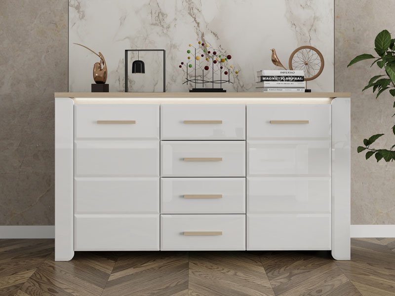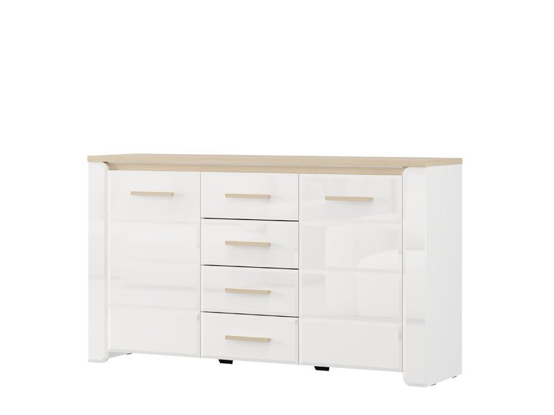 Die Kommode ABERDEEN 154 3K4F2V bietet eine moderne, schlichte und funktionale Lösung zur Einrichtung Ihres Wohnzimmers. Die Kombination aus opak-weißen Dekor, heller Port-Eiche und weißer Hochglanzfolie verleiht dem Raum Eleganz und einen minimalistischen und klar definierten, makellosen Stil. Der Stauraum umfasst zwei geschlossene Segmente und einen zentralen Bereich mit vier Schubladen, die eine praktische Organisation von Gegenständen und Dekorationsdetails ermöglichen. Die Kommode ist Teil des ABERDEEN-Elementsystems zur Wohnzimmereinrichtung.