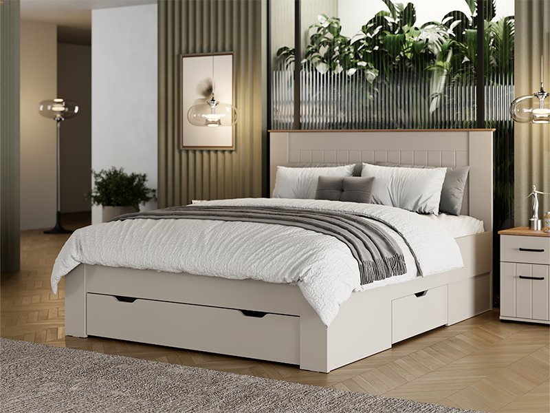 Das Bett ist ohne Untergestell und ohne Matratze konzipiert und für eine Matratze der Abmessungen 160 × 200 cm vorgesehen. Die Funktionalität kann zusätzlich durch die Möglichkeit verbessert werden, eine Schublade, einen Satz mit zwei Schubladen oder einen Satz mit drei Schubladen hinzuzufügen, wodurch mehr Platz für praktische Aufbewahrung geschaffen wird.
