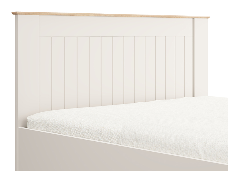 "Das Doppelbett LAMBETH 160, ausgeführt in der Kombination aus Kaschmir und Artisan-Eiche-Dekor, verleiht dem Schlafzimmer ein warmes und rustikales Erscheinungsbild und betont die klar definierte geometrische Designlinie sowie die eingeprägten Rillen auf den Fronten.