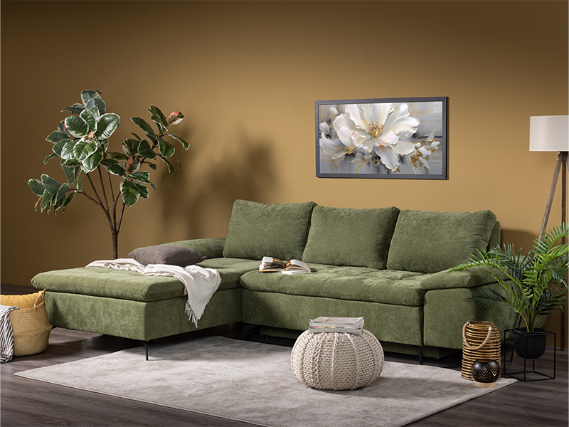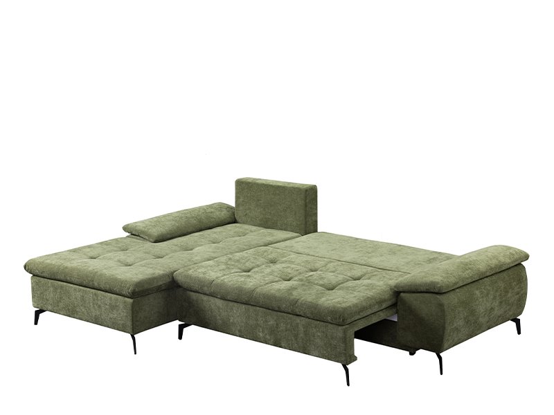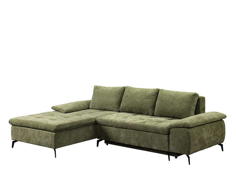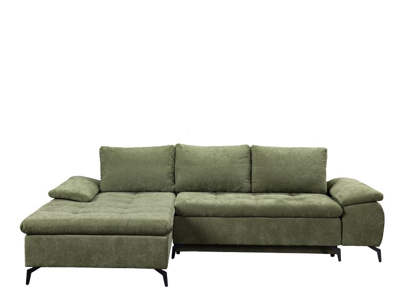 Der genaue Bezeichnung des Stoffmusters lautet: Stoff WIND 34 grün, linke Eckausführung. Die Eckgarnitur ANDI besticht durch ihr modernes Design und ihre Geräumigkeit und ist ideal für zeitgemäß eingerichtete Wohnbereiche. Durch ein praktisches System zum Umklappen der Rückenlehne lässt sie sich mühelos in ein Bett mit einer Schlaffläche von 134 x 200 cm verwandeln. Sie ist aus Schaumstoff gefertigt und bietet ein gutes Komfortniveau für den täglichen Gebrauch. Die Garnitur verfügt über einen Aufbewahrungskasten, praktisch für Bettwäsche und andere Gegenstände.