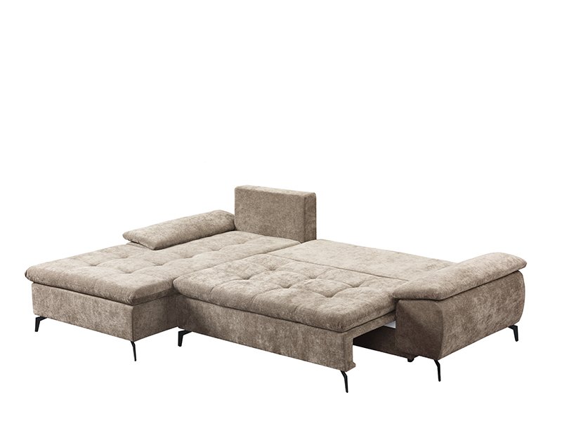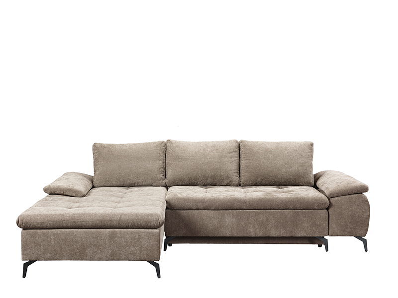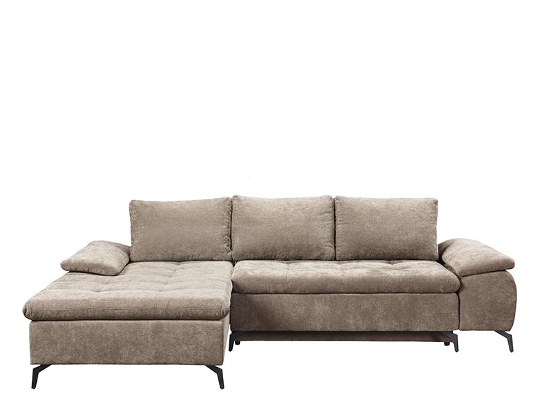 Der genaue Bezeichnung des Stoffmusters lautet: Stoff WIND 11 hellbraun, linke Eckausführung. Die Eckgarnitur ANDI besticht durch ihr modernes Design und ihre Geräumigkeit und ist ideal für zeitgemäß eingerichtete Wohnbereiche. Durch ein praktisches System zum Umklappen der Rückenlehne lässt sie sich mühelos in ein Bett mit einer Schlaffläche von 134 x 200 cm verwandeln. Sie ist aus Schaumstoff gefertigt und bietet ein gutes Komfortniveau für den täglichen Gebrauch. Die Garnitur verfügt über einen Aufbewahrungskasten, praktisch für Bettwäsche und andere Gegenstände.
