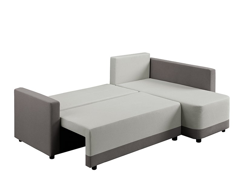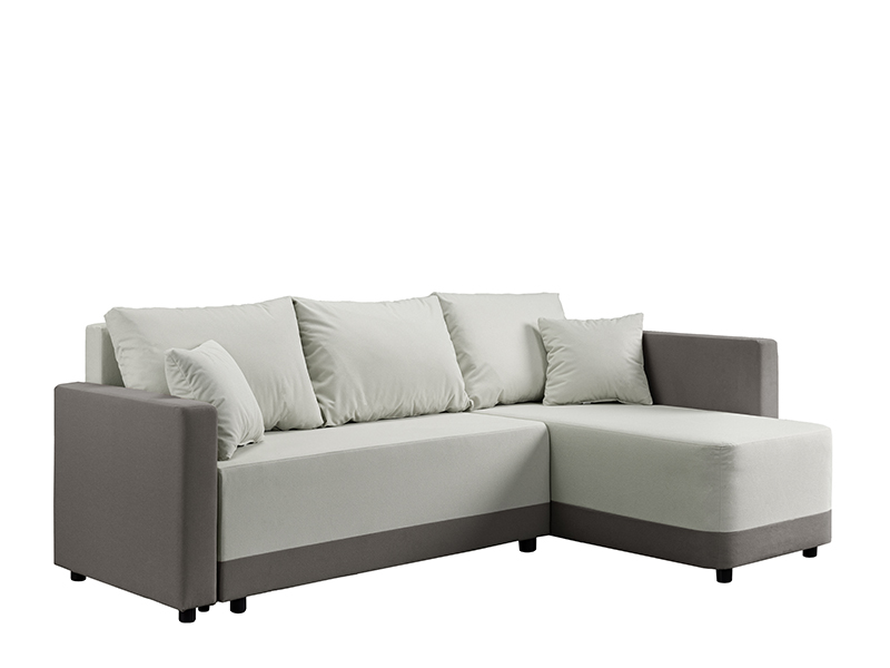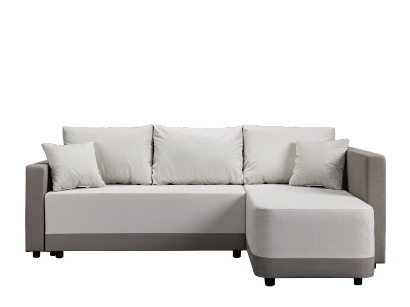 Der genaue Bezeichnung des Stoffmusters lautet: Stoff SAND 82 hellgrau / Stoff SAND 21 grau. Die Eckgarnitur SELENA mit ihrer modernen und harmonischen Form erfüllt ideal die vielseitigen Anforderungen bei der Einrichtung von Wohnbereichen. Durch ein einfaches System zum Umklappen der Rückenlehne lässt sie sich mühelos in ein Bett mit einer Schlaffläche von 115 x 200 cm verwandeln. Die Garnitur ist aus Schaumstoff gefertigt und bietet ein gutes Komfortniveau für den täglichen Gebrauch. Sie verfügt zudem über einen Aufbewahrungskasten, praktisch für Bettwäsche und andere Gegenstände. Die universale Eckausführung ermöglicht eine einfache Integration in verschiedene Raumgestaltungen.