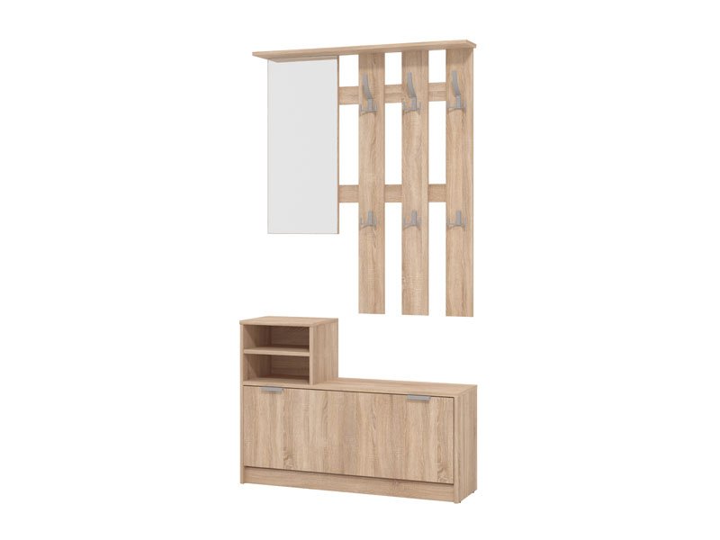 Das Eingangsbereich RAVENNA besteht aus zwei Teilen. Der obere Teil, der an der Wand befestigt wird, trägt die Aufhänger und den Spiegel während der geschlossene untere Teil dem Abstellen von Schuhen dient.