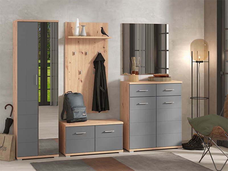 Das Element des Eingangsbereichs LANZAROTE CIV in Artisan Eiche-Dekor ist so entworfen, dass es sich in verschiedene Innenräume des Hauses einpassen lässt. Es kann mit anderen Elementen der Kollektion für den Eingangsbereich LANZAROTE kombiniert werden, womit die Interieur-Geschichte des Eingangs in Ihr Zuhause vervollständigt ist.