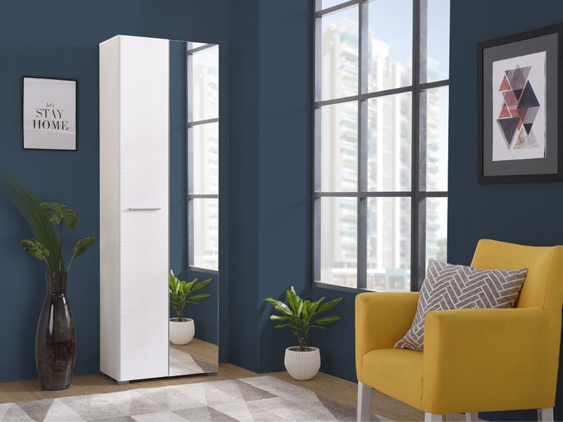 Das Element der Vorzimmers BENY 2K OG, im weißen Design und weißer Lackfolie, wird in Ihr Vorzimmer Frische und Eleganz bringen, sowie die praktische Note, dank dem zweiflügeligen Teil mit drei Regalen und Haken zur Ablage der Garderobe. Es kann mit den Elementen desselben Namens kombiniert werden, die die Geschichte des Eingangs in Ihr Heim vervollständigen.