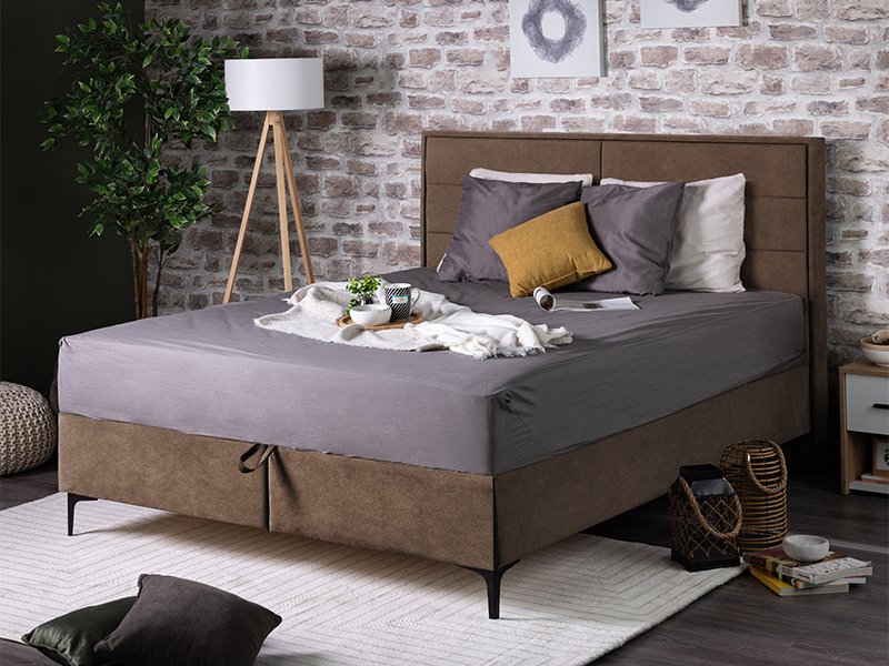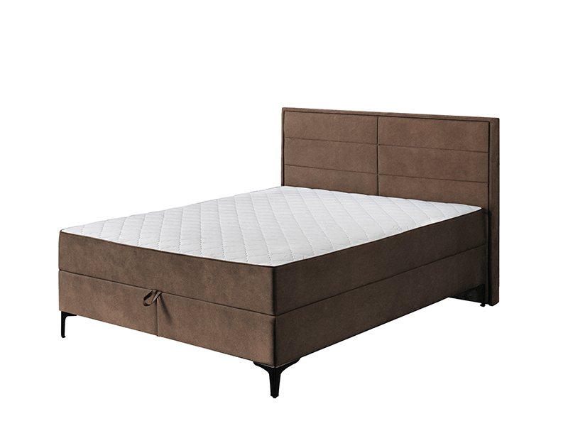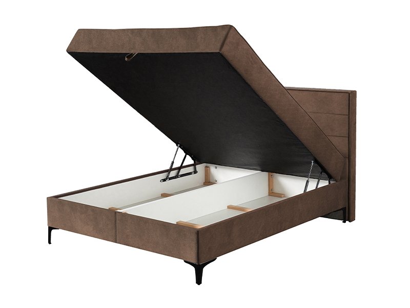 Das französische Bett DUE FRAME in braunem PRESTON 22 Stoffdessin ist mit einem gepolsterten Rahmen und einem Kopfteil aus zwei Teilen veredelt, dessen Ästhetik durch Ziernähte verschönert wurde, die zur Attraktivität beitragen. Das französische Bett DUE FRAME trägt zur Schaffung eines modernen Schlafzimmerambiente bei und lässt sich hervorragend mit einer breiten Palette von Möbeln für die Einrichtung dieses Ambiente kombinieren. Dieses Modell des französischen Bettes hat eine Federkernmatratze, die dank des Scherenmechanismus mit Gasdruckfedern angehoben wird und den Raum mit zwei geräumigen Kästen für Bettzeug freigibt.