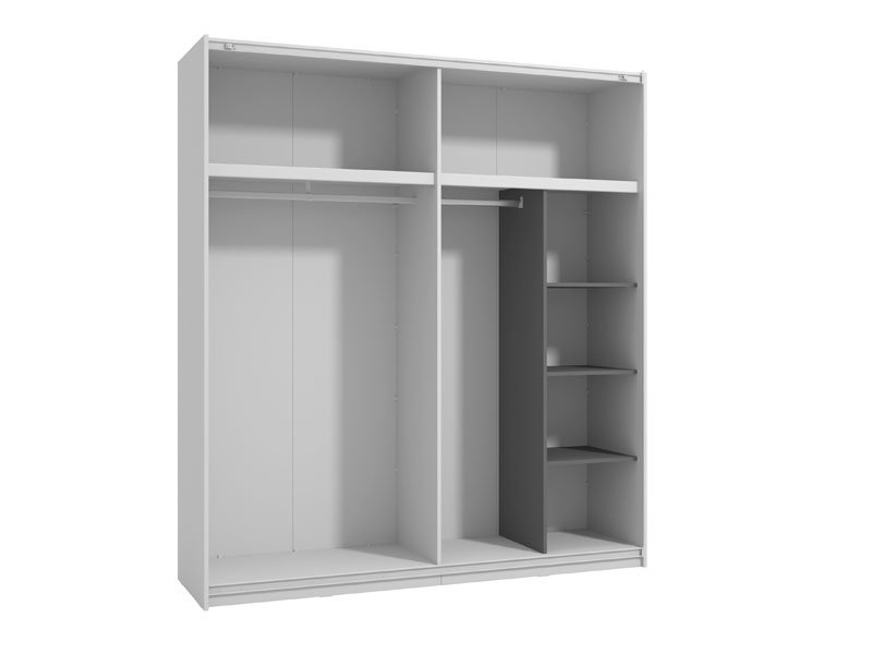 Die genaue Bezeichnung des Musters: Korpus graphitgrau, Ablage graphitgrau. Das Funktionsregal FUP in der Farbe Graphitgrau ist als Zubehör für die Ausstattung von Schiebetürenschränken mit einer Breite von 200 cm und einer Höhe von h217 aus der Serie Forma Ideale vorgesehen. Es besteht aus einem Korpus mit drei Zwischenböden und einer dazu passenden Kleiderstange.
