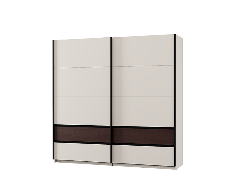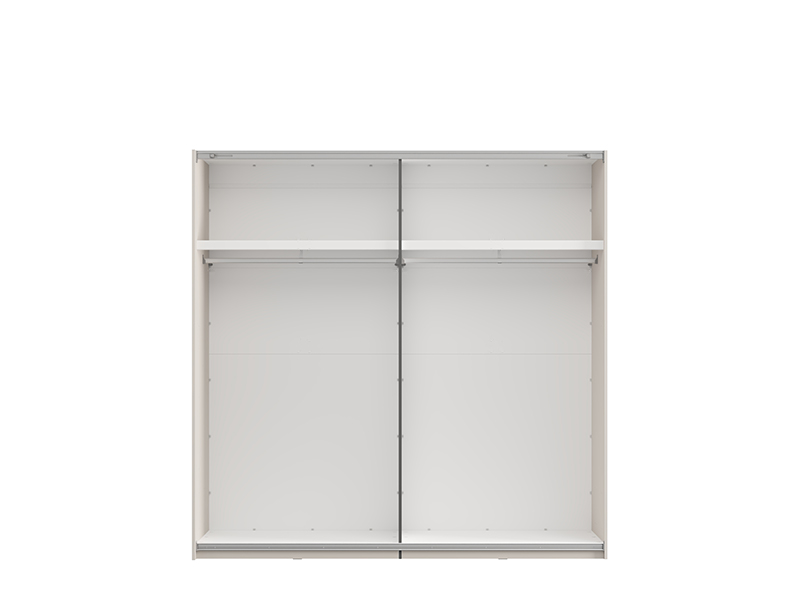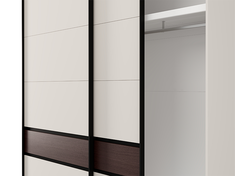 Der Kleiderschrank bietet die Möglichkeit, nachträglich einen zusätzlichen Satz Regale für den Kleiderschrank oder ein Vertikalelement mit Regalen und zwei Schubladen sowie auch ein einzelnes Regal mit Vertikalelement hinzuzufügen, wodurch eine individuelle Raumnutzung und maximale Funktionalität erreicht wird. Zusätzlich besteht die Option, einen Dämpfungsmechanismus für die Schiebetüren und einen Kleiderschrankrahmen sowie eine Beleuchtung hinzuzufügen, was die Praktikabilität und das visuelle Erlebnis des Elements verbessert.