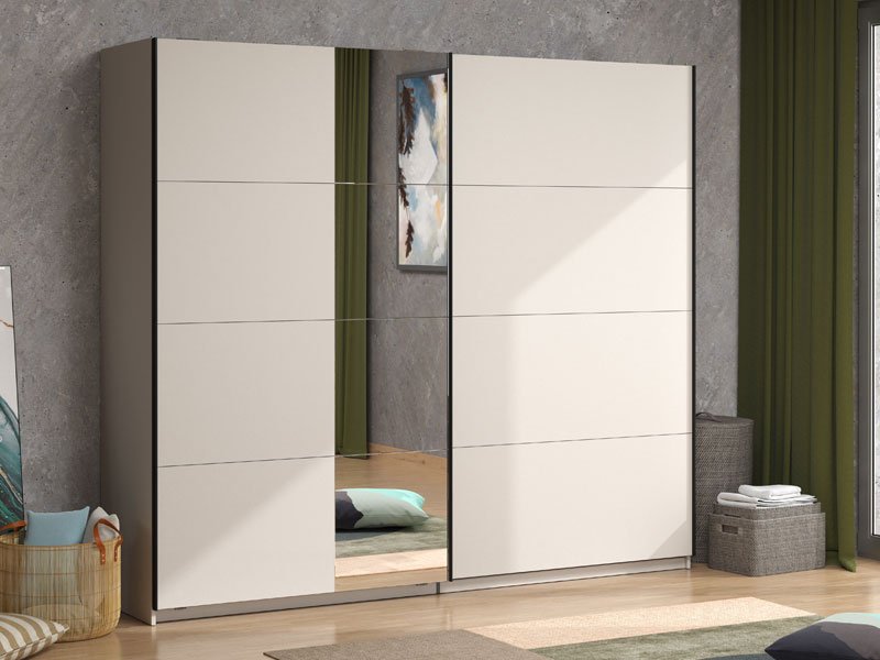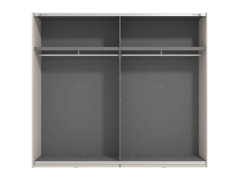 Das Kleiderschrankmodell GARD 245 OG h217 mit Schiebetüren, in Kashmir-Dekor und einem Segment mit Spiegel auf der linken Front trägt zur Funktionalität, Ästhetik und maximalen Raumausnutzung des Innenraums bei. Der Stauraum dieses Modells umfasst die Kleiderstangen für die Garderobe und je ein praktisches Regal auf der linken und rechten Seite. Optional kann es mit einem für dieses Kleiderschrankmodell geeigneten Regal-Set oder mit anderen funktionalen Aufbaumodulen sowie mit Türdämpfern für leises, sanftes Schließen der Schiebetüren nachgerüstet werden.