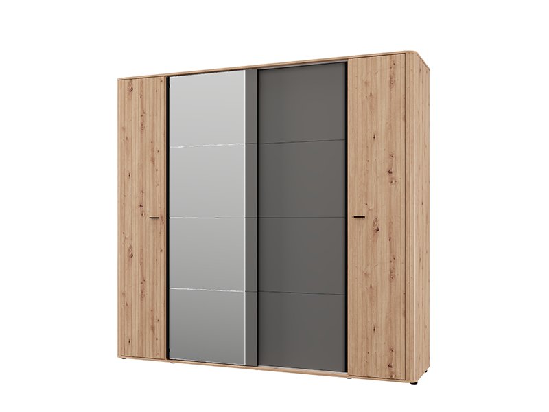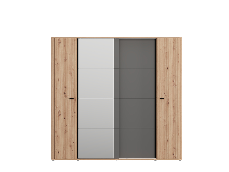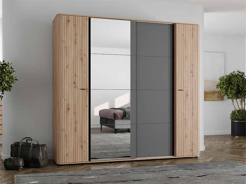 "Der Kleiderschrank SINOP 150 KL2K OG h217, ausgeführt in der Kombination der Dekore Artisan-Eiche, Artisan-Eiche-Folie, Graphitgrau und Schwarzholz-Dekor, verleiht dem Schlafzimmer ein modernes und anspruchsvolles Erscheinungsbild und betont den Kontrast sowie die klar definierte geometrische Designlinie.