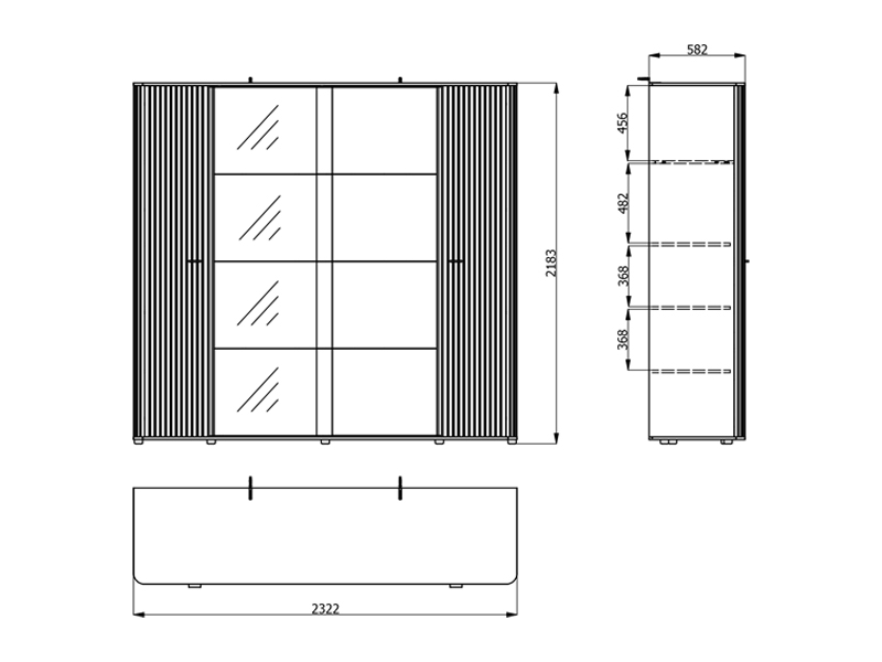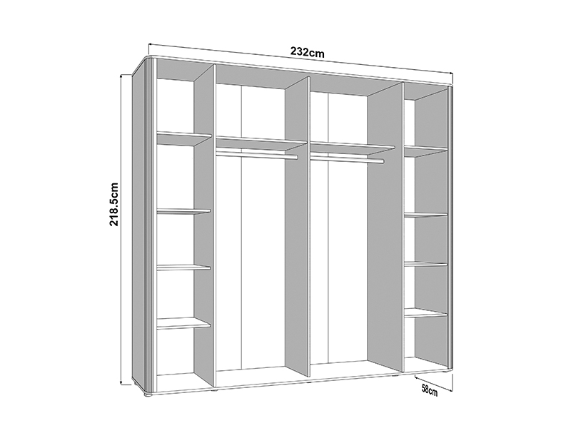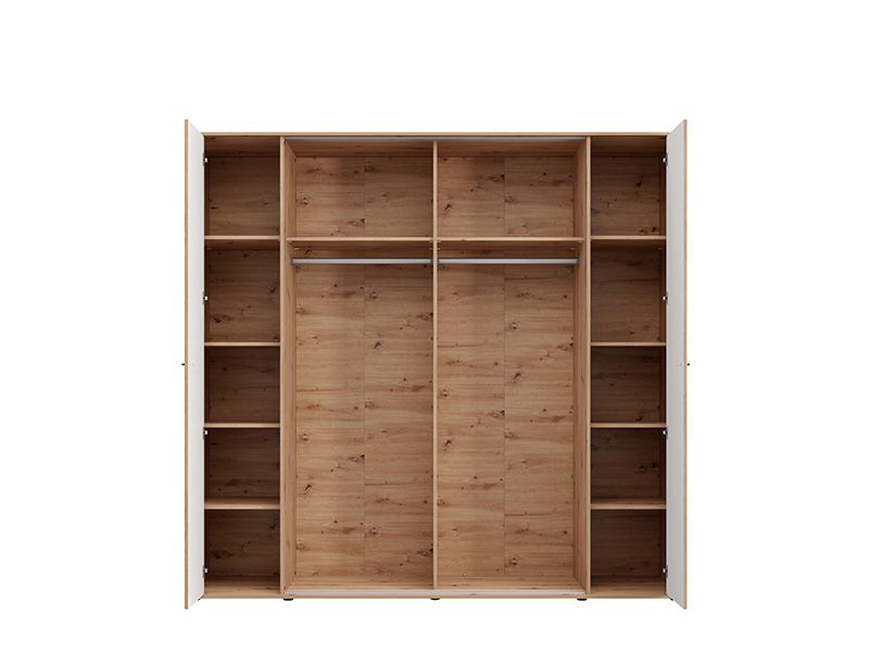 Der Stauraum des Kleiderschranks besteht aus zwei Kleiderstangen und zwei Fächern, was eine übersichtliche und praktische Aufbewahrung von Kleidung und Kleinigkeiten ermöglicht. Eine der Fronten ist mit einem Spiegel ausgestattet, der die Funktionalität zusätzlich verbessert und den Raum visuell erweitert.