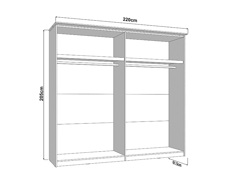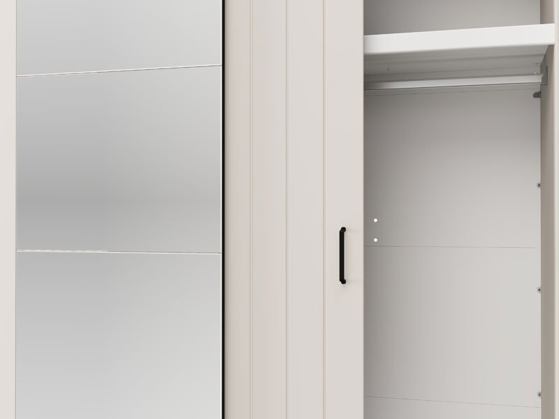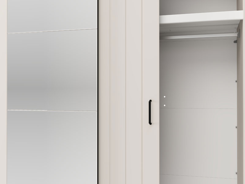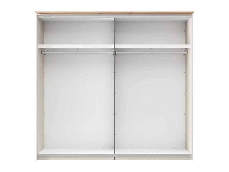 In seiner Grundausstattung umfasst der Stauraum zwei Kleiderstangen, die eine übersichtliche und praktische Aufbewahrung der Kleidung ermöglichen. Der Kleiderschrank bietet die Möglichkeit, nachträglich Regale, Schubladen sowie Vertikaleinheiten zur individuellen Organisation des Stauraums hinzuzufügen, was die Funktionalität weiter erhöht. Außerdem besteht die Option, einen Dämpfungsmechanismus für die Schiebetüren und einen Kleiderschrankrahmen sowie eine Beleuchtung hinzuzufügen, wodurch der Komfort und das visuelle Raumerlebnis verbessert werden.
