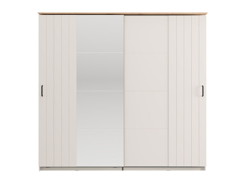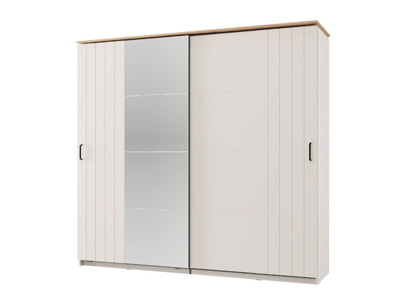 Der Kleiderschrank LAMBETH 220 OG h205, ausgeführt in der Kombination aus Kaschmir und Artisan-Eiche-Dekor, verleiht dem Schlafzimmer ein warmes und rustikales Erscheinungsbild und betont die klar definierte geometrische Designlinie sowie die eingeprägten Rillen auf den Fronten.