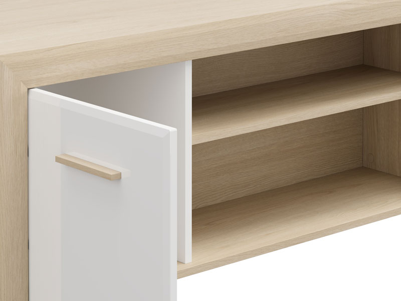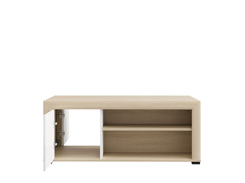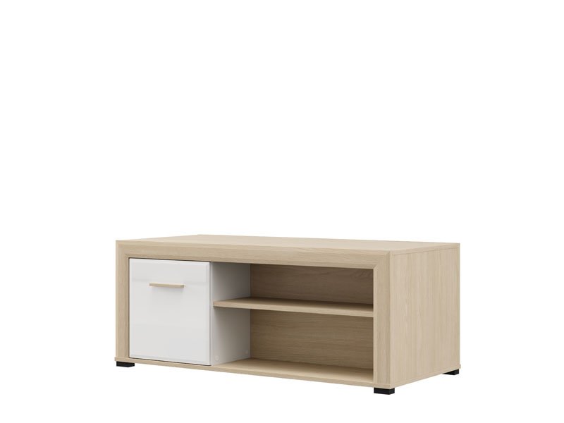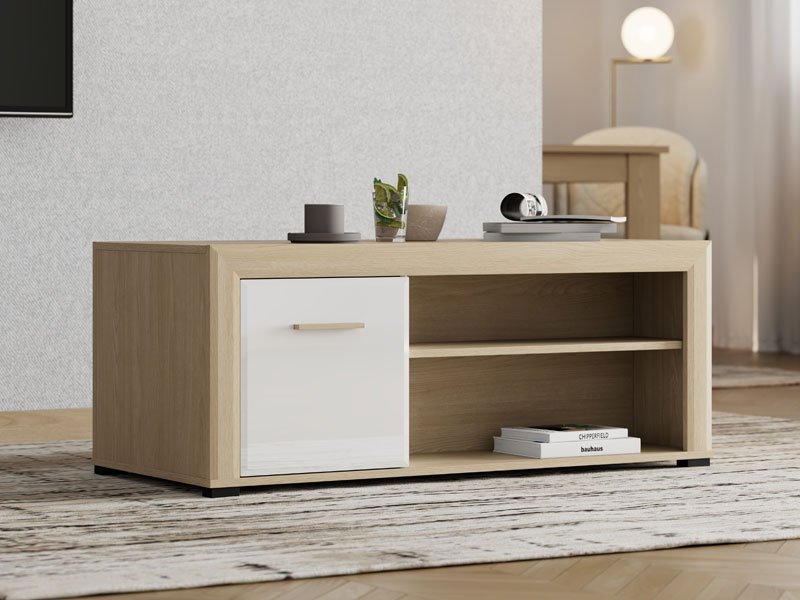 Der Couchtisch CARLOW ist eine praktische und ästhetisch ansprechende Ergänzung für das Wohnzimmer. Die Kombination aus opak-weißen Dekor, heller Port-Eiche, weißer Hochglanzfolie und heller Port-Eiche-Folie verleiht dem Raum Funktionalität, Wärme und moderne Ästhetik. Der Stauraum umfasst ein beidseitig zugängliches Bereich sowie ein Regal unter der Arbeitsplatte zur praktischen Aufbewahrung. Der Couchtisch CARLOW ist Teil des CARLOW-Elementsystems zur Wohnzimmereinrichtung und trägt zu einer harmonischen und attraktiven Wohnraumgestaltung bei.