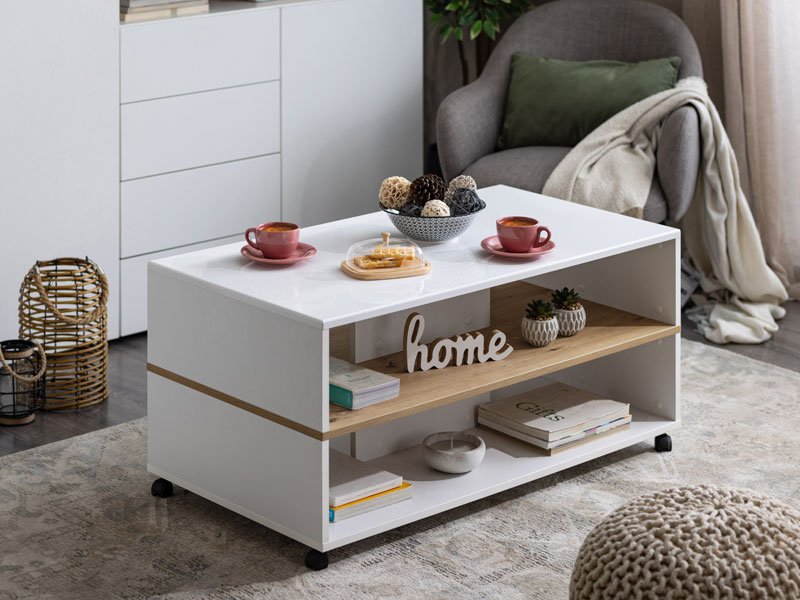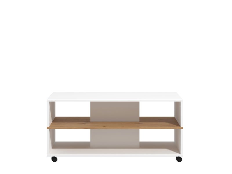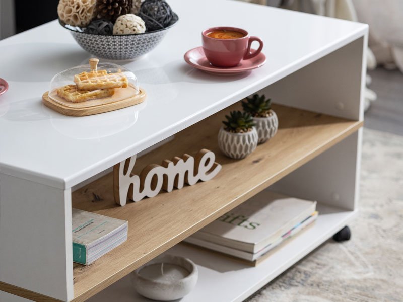 Der Couchtisch SAVIO, in einer Dekorkombination aus opakweißem Dekor, Artisan Eiche und weißer Lackfolie, hat praktische und ästhetische Vorteile. Das dominierende Detail im Erscheinungsbild dieses Couchtisches ist ein effektives Regal in kontrastierendem Dekor unter der Arbeitsfläche, geeignet für die Aufbewahrung Ihrer Lieblingsbücher oder Zeitschriften. Der Couchtisch SAVIO trägt zu einem zeitgemäßen thematischen Konzept der Wohnzimmereinrichtung bei.