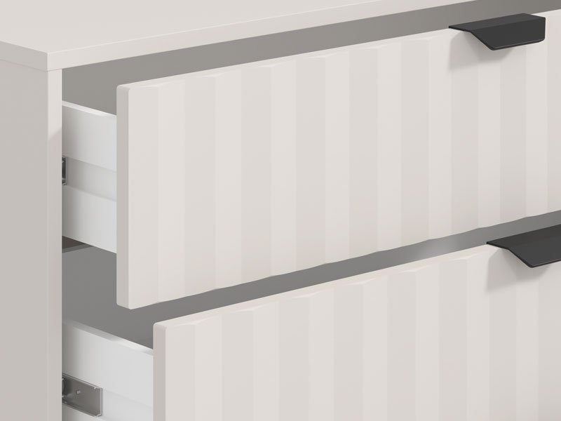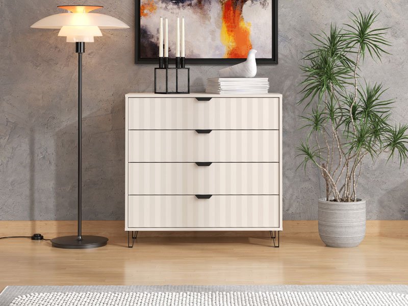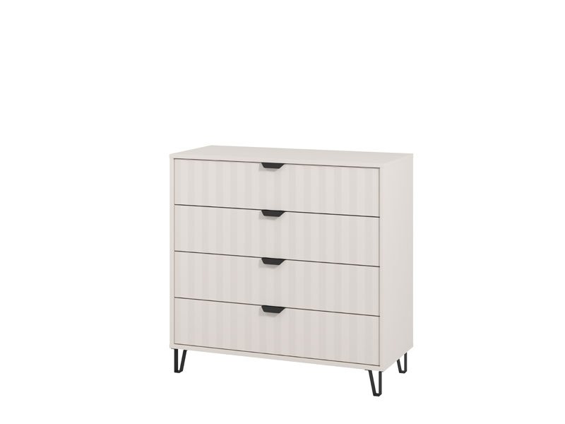 Die Kommode BREST 4F in einer Kombination der Dekore Kaschmir und Kaschmir Folie ist so konzipiert, dass sie dank des Stauraums, den die vier geräumigen Schubladen bieten, zu den Elementen mit hohem Gebrauchswert gehört. Die Kommode BREST 4F eignet sich für die Einrichtung des Flurs, des Wohnzimmers, des Kinder- oder Schlafzimmers.