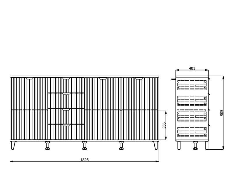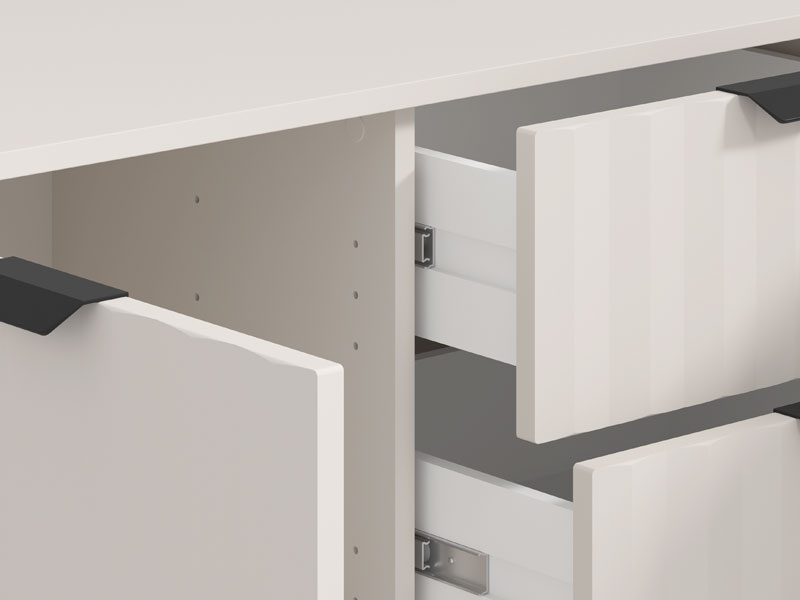 Der übersichtlich angeordnete Stauraum dieser Kommode besteht aus drei geschlossenen Fächern und vier praktischen Schubladen.