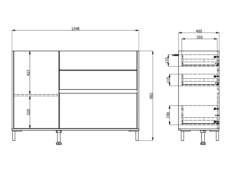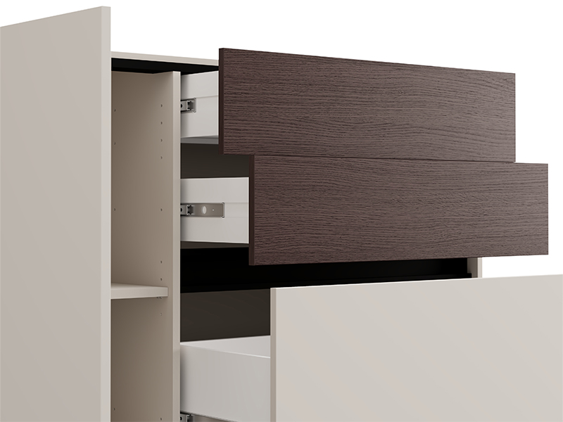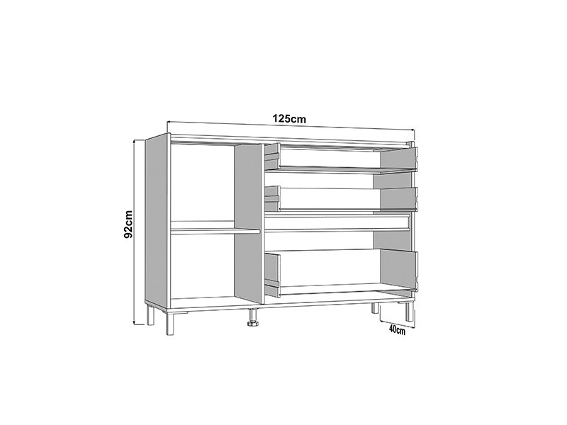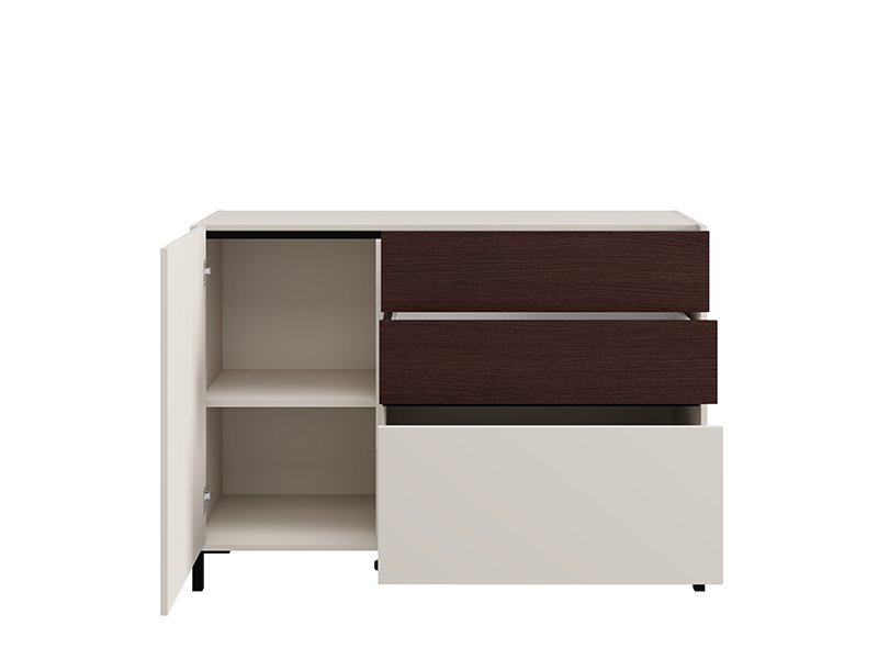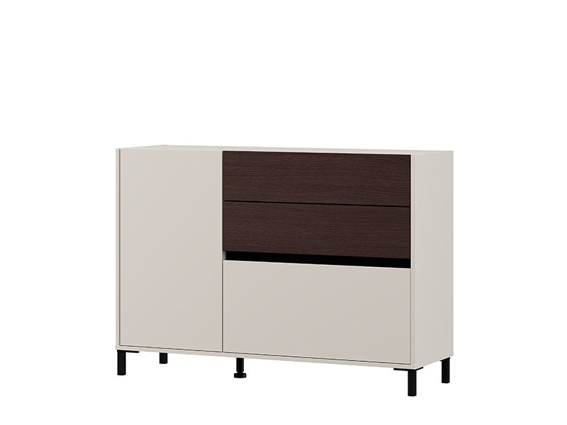 "Die Kommode COLHIDA 125 2K3F1V, ausgeführt überwiegend in Kaschmir Dekor in Kombination mit dunkler Taylor-Eiche und Schwarz-Dekor, verleiht dem Schlafzimmer ein elegantes und kontrastreiches Erscheinungsbild. Dieses Modell verfügt über ein geschlossenes Bereich und einen Teil mit drei Schubladen, was eine übersichtliche und praktische Aufbewahrung von Kleidung und Kleinigkeiten ermöglicht.