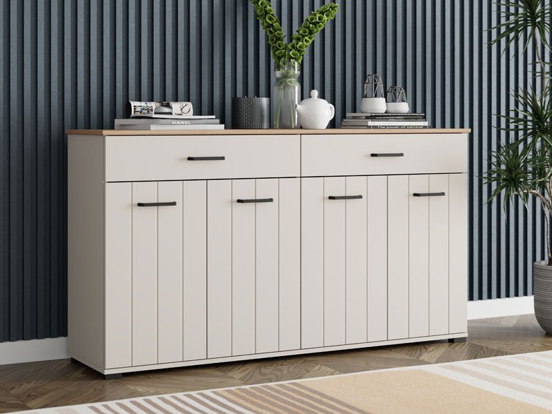 Die Kommode LAMBETH 156 4K2F4V in der Dekorkombination Kaschmir und Artisan-Eiche verleiht dem Raum Wärme und einen rustikalen Charakter dank der speziellen Oberflächenveredelung mit reliefartig eingeprägten Rillen auf den Fronten. Der Stauraum besteht aus vier geschlossenen Fächern und zwei geräumigen Schubladen, die eine praktische und organisierte Aufbewahrung verschiedener Gegenstände – von Dokumenten und Kleinigkeiten bis hin zu Dekorationsdetails – ermöglichen. Die Kommode LAMBETH 156 4K2F4V ist Teil des LAMBETH-Elementsystems, das sich durch einen ästhetisch ausgeprägten Stil und Funktionalität auszeichnet.