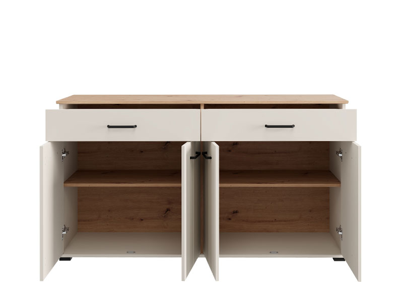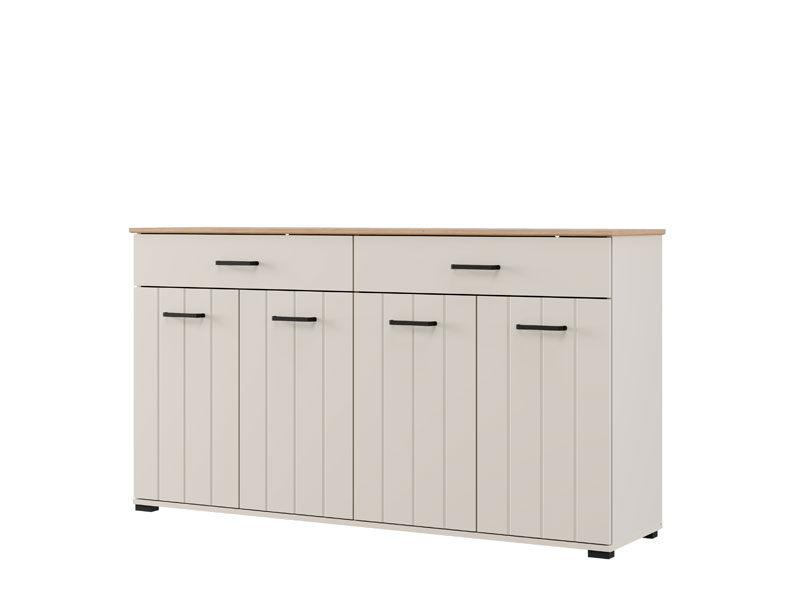 | Komoda LAMBETH 156 4K2F4V u kombinaciji dekora kašmira i artisan hrasta unosi u prostor toplinu i rustičan karakter, zahvaljujući posebnoj završnoj obradi u vidu prugica utisnutih na frontove. Upotrebni prostor čine četiri zatvorena pregradna dela i dve prostrane fioke, koje omogućavaju praktično i organizovano odlaganje različitih predmeta, od dokumentacije i sitnica do dekorativnih detalja. Komoda LAMBETH 156 4K2F4V je deo sistema elemenata LAMBETH, koji odlikuje estetski izražen stil i funkcionalnost. |
