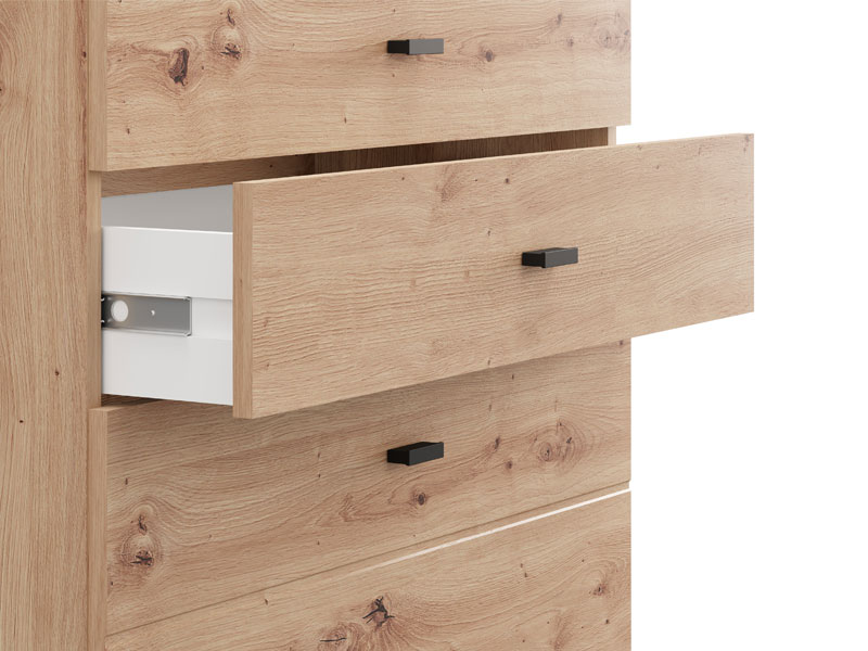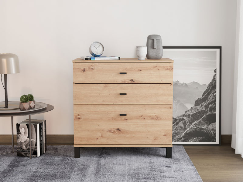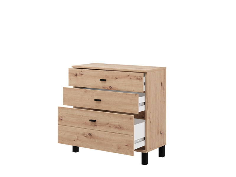 Die Kommode ALMOND 77 3F im Artisan-Eiche-Dekor verleiht dem Raum Wärme und eine angenehme Atmosphäre, mit einfachem und funktionalem Design. Der Stauraum besteht aus drei Schubladen, von denen eine tiefer ist und für die Aufbewahrung größerer Gegenstände geeignet dient, während die anderen beiden für kleinere Gegenstände geeignet sind. Dank ihrer kompakten Maße und der natürlichen Ästhetik des Holzdekors ist die Kommode ALMOND 77 3F eine praktische Lösung für die Einrichtung von Schlafzimmer, Flur oder kleineren Wohnbereichen.