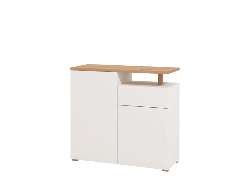 Die Kommode ATERNO 103 2K1F2V in der Kombination aus Opak Weiß und Artisan Eiche unterstreicht das ästhetische Erlebnis des Interieurs und ist vollständig an moderne Lebensgewohnheiten angepasst. Neben ihrer herausragenden praktischen Anwendung, dank geschlossener Fächer, einer Schublade und einer offenen Regalfläche, ist sie eine exzellente Wahl für die Gestaltung verschiedener Wohnumgebungen.