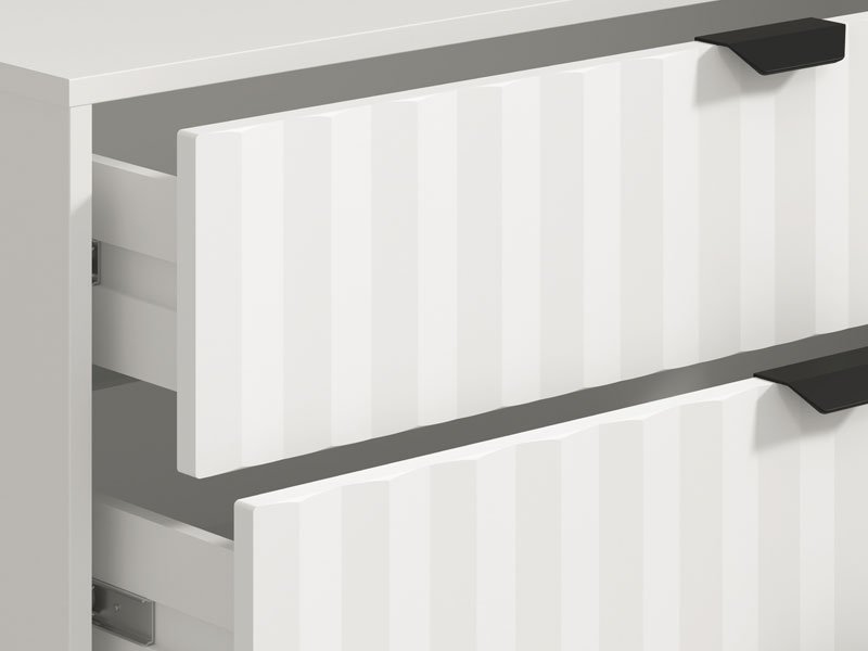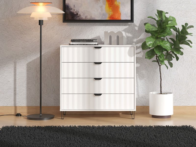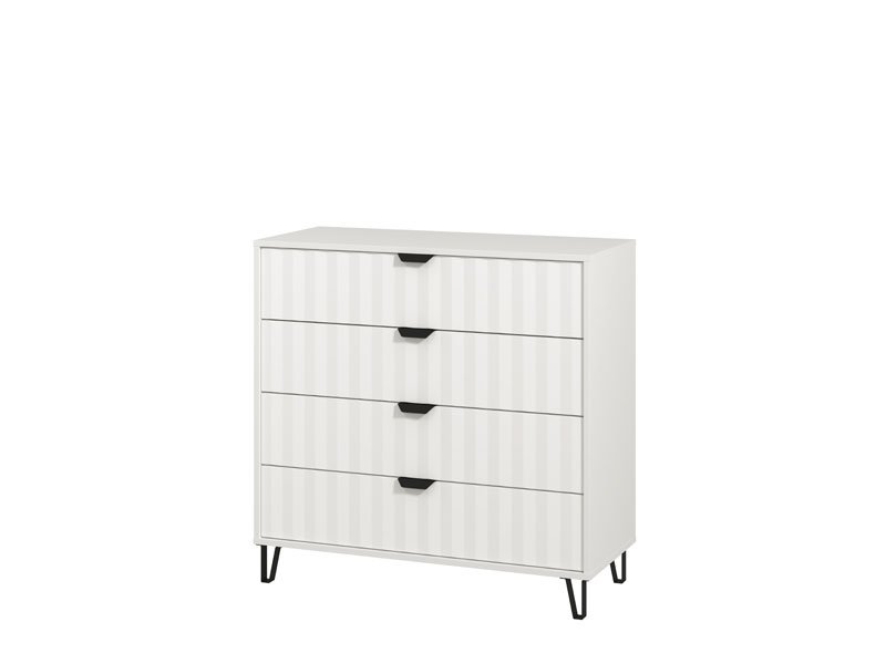 Die Kommode BREST 4F in einer Kombination der Dekore Opakweiß und mattweiße Folie ist so konzipiert, dass sie dank des Stauraums, den die vier geräumigen Schubladen bieten, zu den Elementen mit hohem Gebrauchswert gehört. Die Kommode BREST 4F eignet sich für die Einrichtung des Flurs, des Wohnzimmers, des Kinder- oder Schlafzimmers.