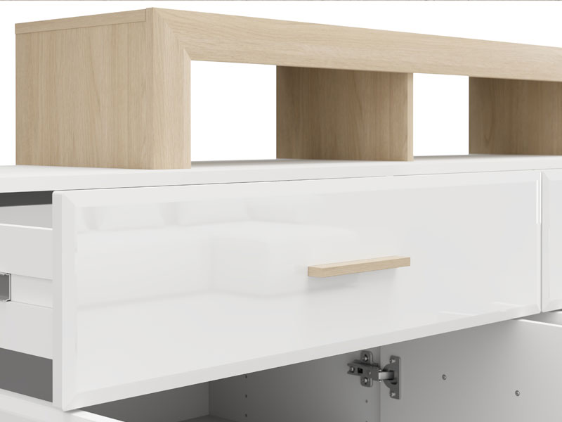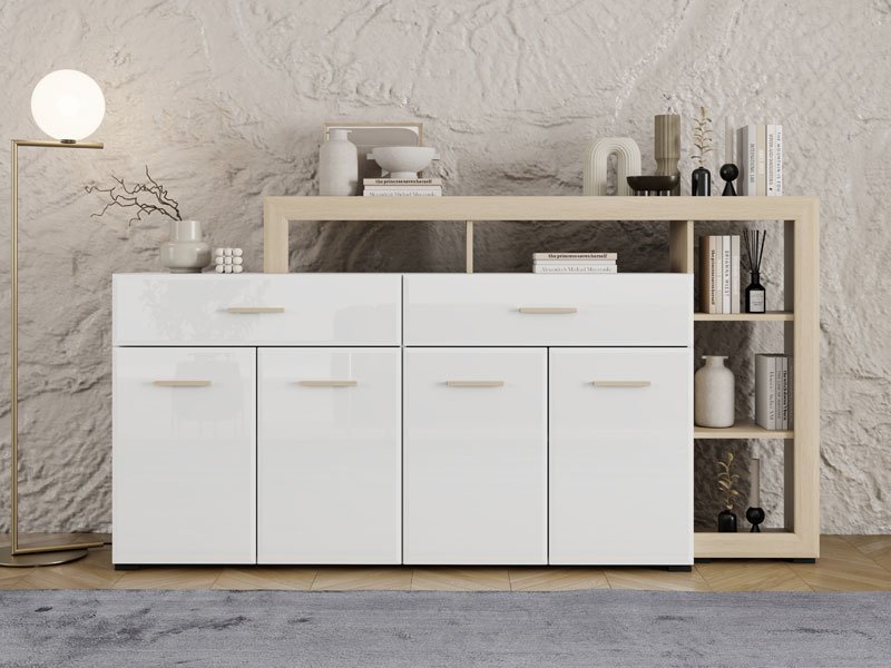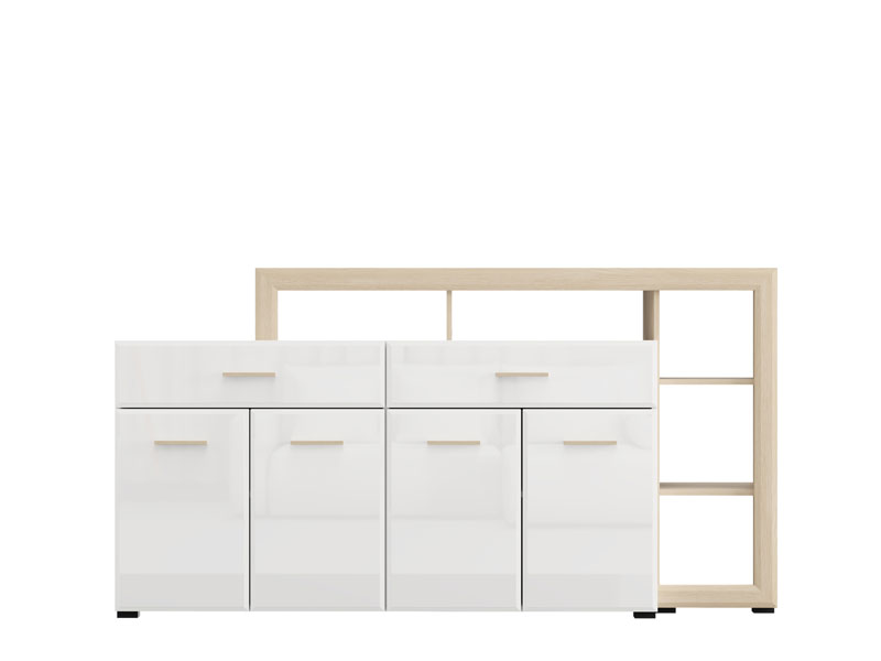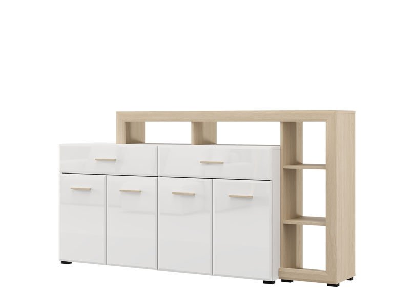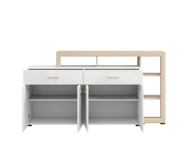 Die Kommode CARLOW 189 4K2F4V ist ein praktisches und visuell attraktives Element zur Einrichtung Ihres Wohnzimmers. Die Kombination aus opak-weißen Dekor, heller Port-Eiche, weißer Hochglanzfolie und heller Port-Eiche-Folie trägt zu einem modernen und warmen Ambiente bei, mit deutlich betonter ästhetischer Abstimmung zu den anderen Elementen des Systems. Der Stauraum umfasst vier geschlossene Fächer, zwei geräumige Schubladen und attraktiv angeordnete offene Regale, die eine funktionale Organisation und Präsentation von Dekorationsdetails ermöglichen. Die Kommode ist Teil des CARLOW-Elementsystems zur Wohnzimmereinrichtung, welches eine moderne und ganzheitliche Lösung für die stilvolle Gestaltung Ihres Wohnambientes darstellt.