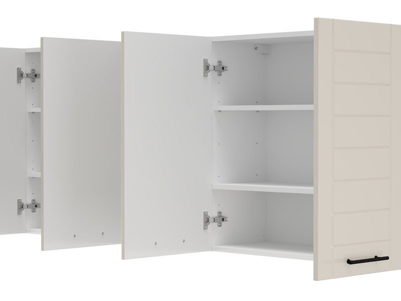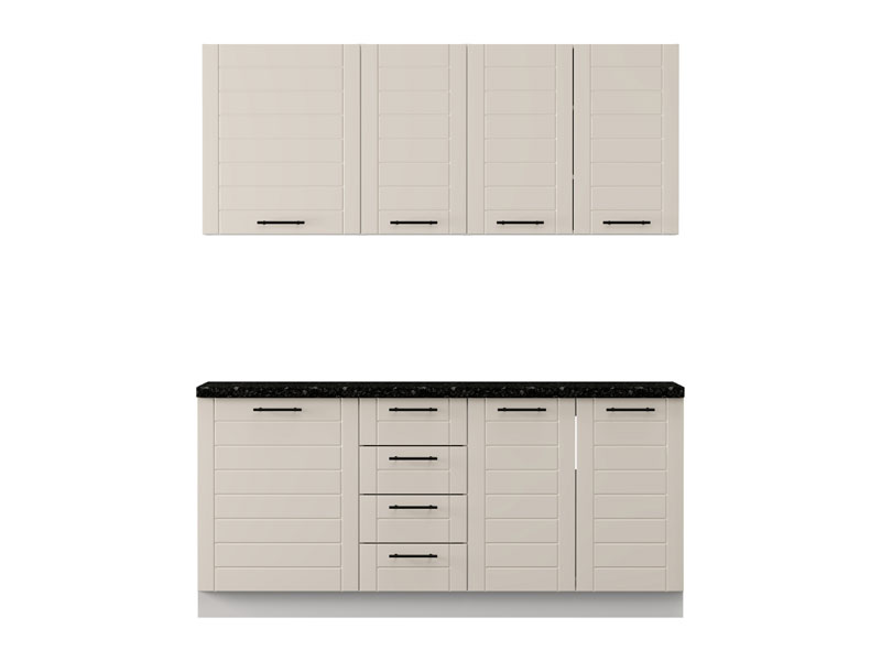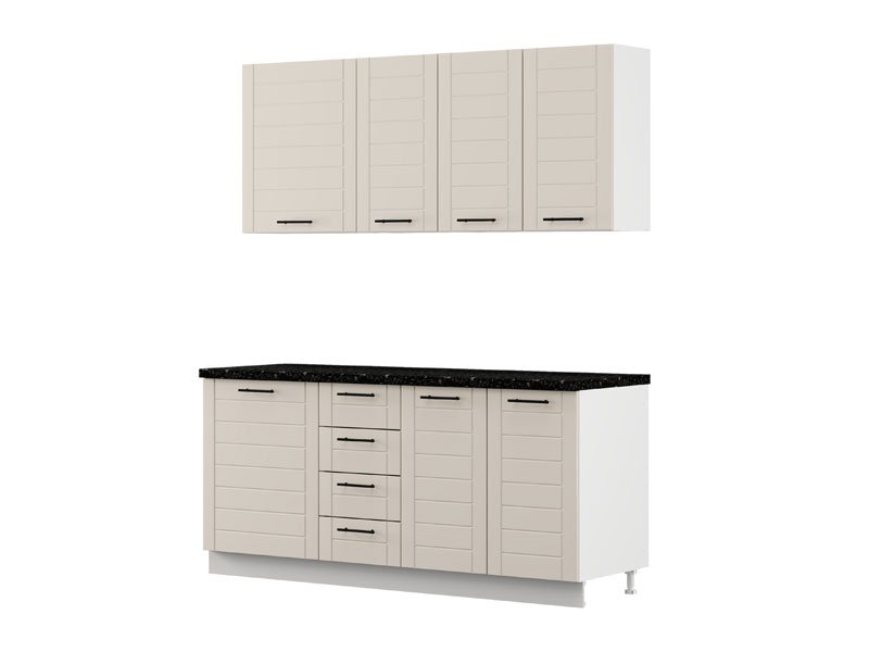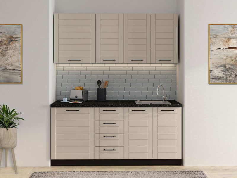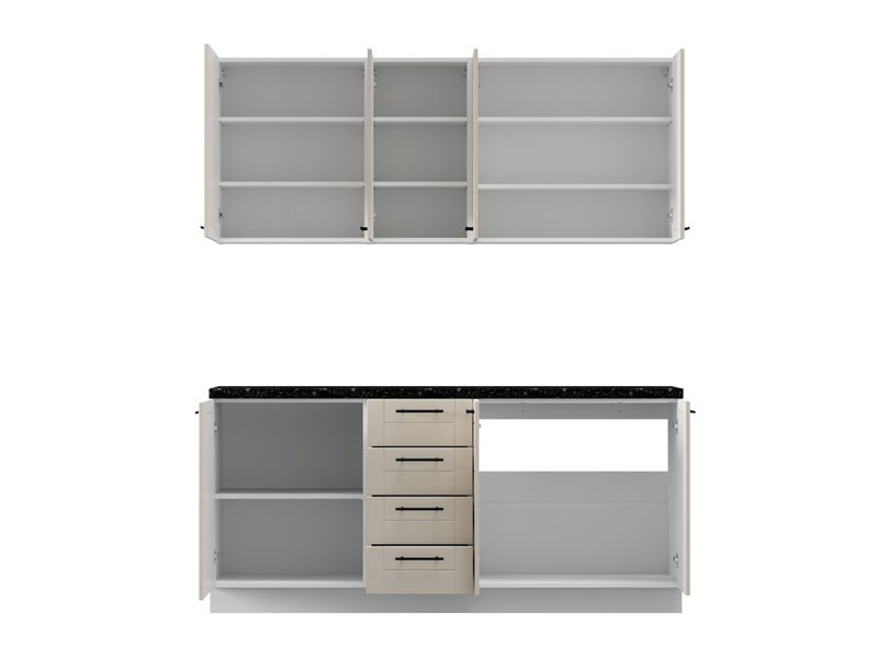 Die Küche DRINA 180, ausgeführt in der modernen Kombination aus opak-weißem Dekor und Sand-Lackfolie, stellt eine funktionale sowie ästhetisch ausgewogene Lösung für moderne Küchenräume dar. Ihr reduziertes Design, klare Linien und neutrale Töne ermöglichen eine einfache Integration in verschiedene Einrichtungsstile und tragen zum Gefühl von Ordnung und Helligkeit im Raum bei. Alle Oberelemente sind als geschlossene Schrankelemente gestaltet, was ein harmonisches und minimalistisches Erscheinungsbild erzielt, während ein Unterbausegment mit vier praktischen Schubladen eine effiziente Organisation und einfache Unterbringung von Küchenutensilien ermöglicht. Die Küche wird ohne Spüle und Arbeitsplatte geliefert, wobei die Gesamttiefe mit Arbeitsplatte 60 cm beträgt und somit ist dieses Modell ideal für eine rationelle Raumplanung sowie den täglichen Gebrauch geeignet.