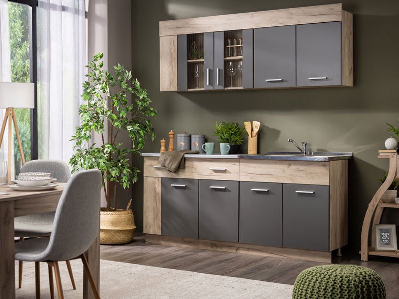 Die Küche LEONA in der Dekor-Kombination aus grauer Eiche und Graphitgrau ist eine ideale Wahl für die Ausstattung von Räumen unterschiedlicher Größen, und ihr Dekor, das den aktuellen Trends im Interieur entspricht, sorgt für eine angenehme und praktisch organisierte Umgebung. Dieses Modell zeichnet sich durch halbverglaste Hängeschränke aus, die zur Ästhetik beitragen, sowie durch eine geräumige Schublade.