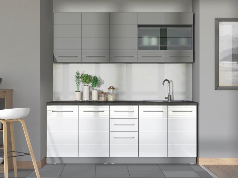 Die Küche PETRA 200 ist eine Komplettlösung für die Einrichtung von Küchenräumen. Das einzigartige zeitgenössische Design in einer Kombination aus graphitgrauer Farbe, weißer Lackfolie und grauer Mattfolie erfüllt die ästhetischen Anforderungen bei der Dekoration jeder Umgebung. Er verfügt über einen praktisch angeordneten Stauraum, bestehend aus Trennwänden im unteren und hängenden Segment, sowie zwei Schubladen.*Hinweis: Der Preis versteht sich ohne Arbeitsplatte und Spüle..