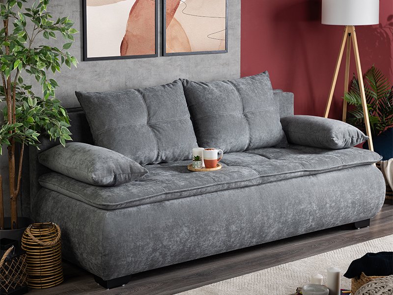 Der genaue Name des Musters: Sitzfläche/Rückenlehne/Großkissen/Kleinkissen – Stoff Wind 89 Dunkelgrau. Das Sofa MINA vereint modernes Design und Stoff mit hochfunktionalen Eigenschaften und erfüllt alle Anforderungen an einen modernen Wohnraum. Eine Aufbewahrungsbox für Bettwäsche steigert die Funktionalität, während die nutzbare Fläche zum Ausruhen und Schlafen (150x198 cm ) zusätzlichen Komfort bieten.