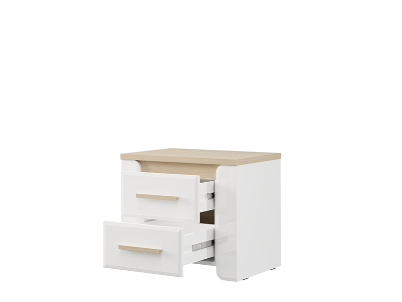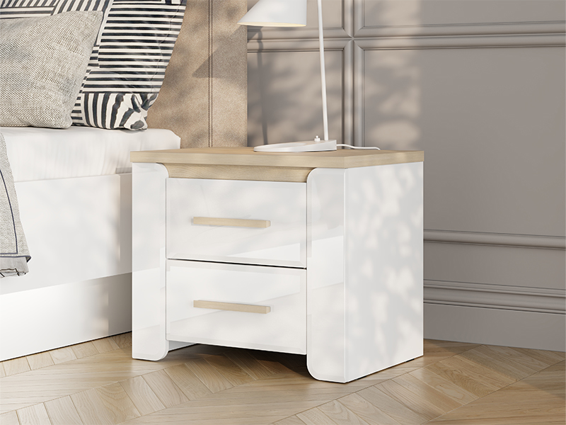 "Der Nachttisch ABERDEEN NO2F, ausgeführt in der Kombination aus opak-weißem Dekor, heller Port-Eiche und weißer Hochglanzfolie, trägt zu einem modernen und eleganten Erscheinungsbild des Schlafzimmers bei und bietet gleichzeitig einen funktionalen und übersichtlichen Stauraum neben dem Bett.